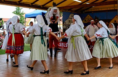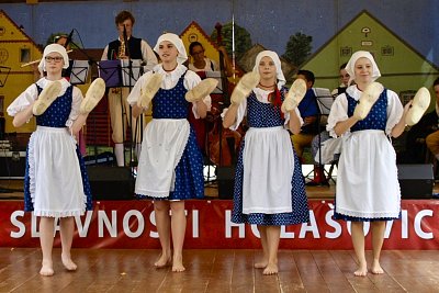 K jednomu ze zlatých hřebů holašovických slavností patřilo vystoupení prachatického souboru Libín a jeho mladé odnože Libíňáčku. Děvčata (kromě jiného) předvedla dřevákový tanec, a na závěr si přišla vyhodit z kopýtek i bujná kobyla :-)).