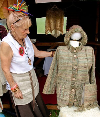Mezi mnoha prodejci mne zaujaly nádherné mohérové výrobky drobné elegantní pletařky u kolovrátku. Paní Hana Plšková z Benešova u Boskovic je členkou SCHOK (Svaz chovatelů ovcí a koz), kde na ni zájemci naleznou i kontakt. Je chovatelkou srstnatých mohérových/angorských koz. Dříve chovala i mléčná plemena, ale vzhledem k tomu, že se o vše stará sama, musela chov zredukovat. Její zvířata dosahují nejvyšších ocenění Elity rekord. Paní Plšková je rovněž držitelkou i mnoha certifikátů kvality. Nejde však jen o chov a péči jako takovou, např. krmení, ale i stříhání vlny, její spřádání, pletení ... Kromě krásných šál, svetrů, ponč, čepic, klubíček hebké vlny apod. mi paní Hana předvedla i krásný kabátek s kloboukem a taškou, které si upletla pro sebe.