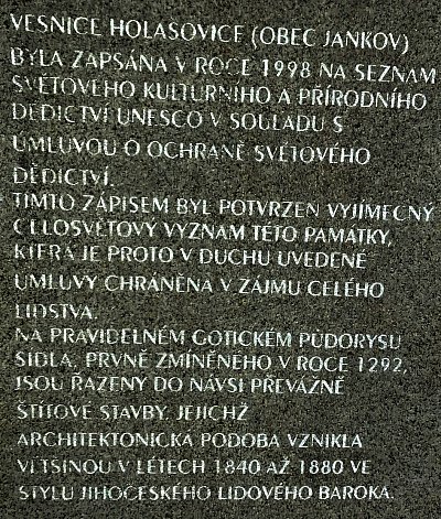 Jednou z dominant holašovické návsi je Pomník zápisu Holašovic na seznam UNESCO