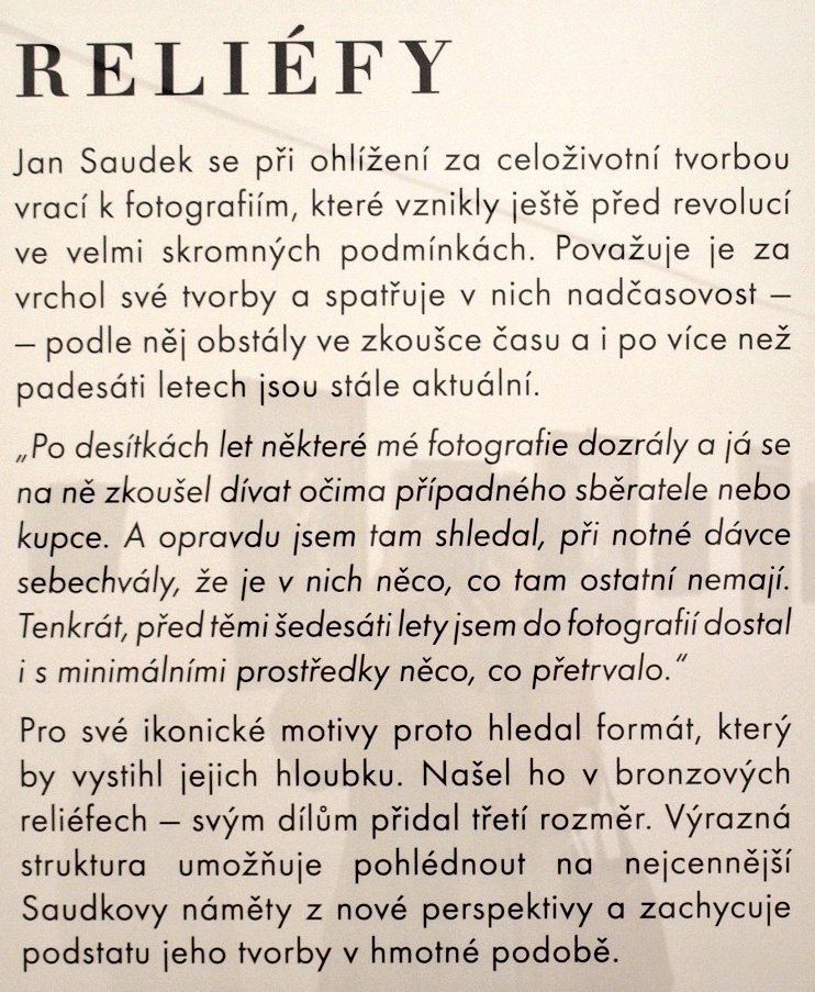 Výstava byla nevelká rozsahem, ale výjimečná svou prezentací. Saudkova díla byla rozdělena do tří tematických celků. Hned v úvodu si návštěvníci mohli prohlédnout ikonické fotografie z jeho počátků s ukázkami z dobových časopisů a obalů gramofonových desek a knih, většinou vydaných v zahraničí. Ve druhém sále byly k shlédnutí některé ze Saudkových obrazů a na závěr byly poprvé k vidění i bronzové reliéfy – dle jeho slov osobní tečka za celoživotní tvorbou.