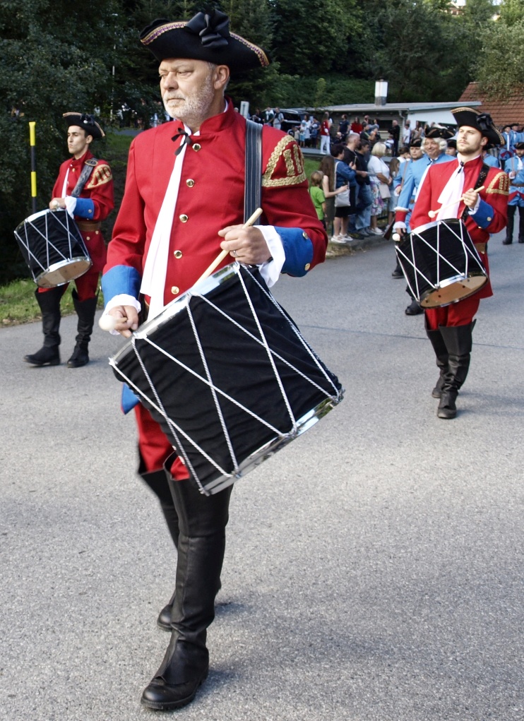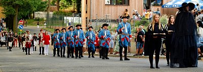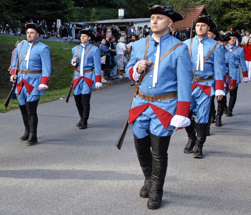 Za neustálého bubnování a a dusotu pochodujících dragounů průvod asi dvou set postav v historických kostýmech prochází pomalu městem.