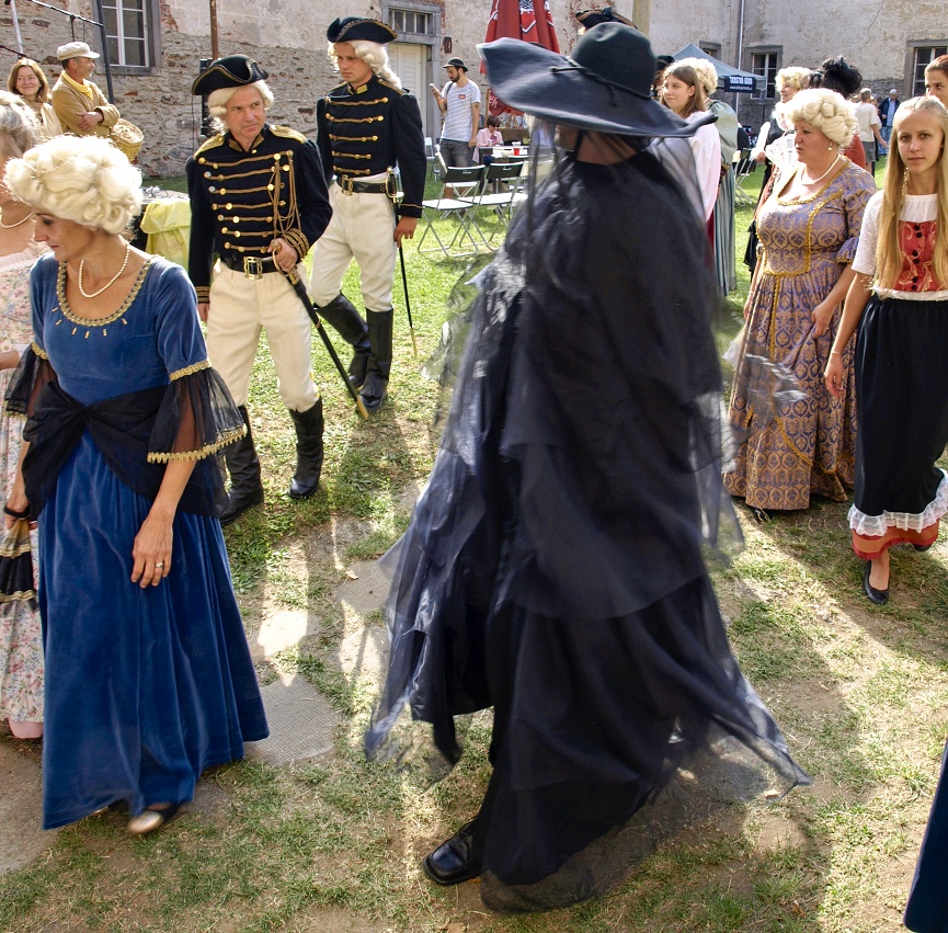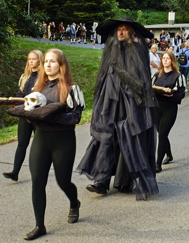 Na scéně se objevuje hlavní postava průvodu. Tajemná vysoká osoba v černém hábitu s černým kloboukem se širokou krempou, z níž splývá černý závoj přes obličej. Nejděsivější ze všech. Symbol Moru. Doprovázejí jej čtyři morová pážata v černých kostýmech. První z nich nese na podušce lebku, ostatní na ní mají zkřížené hnáty. Do toho víří bubny jako před popravou. Atmosféra je nesmírně tíživá. Memento mori. Na smrt pamatuj. A opět kordon pochodujících schönbornských dragounů.