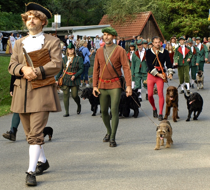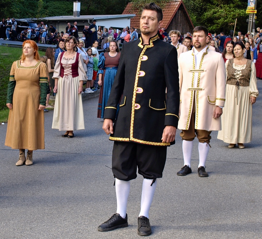 Přihlížející dav si přece jen trochu vydechne a pozoruje další příchozí. Zámečtí písaři, lovčí a lesní se smečkou loveckých psů. Ti jediní po sobě i divácích vesele ňafají. A již procházejí pážata s korunou, následovaná panským správcem. Drábové nervózně mrskají důtkami. Objevuje se panské služebnictvo - komorné a komorníci a již přichází vlajkonoš se standardou vládnoucího rodu Collalto.