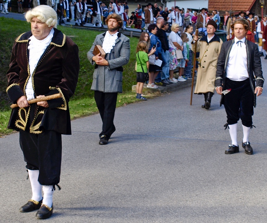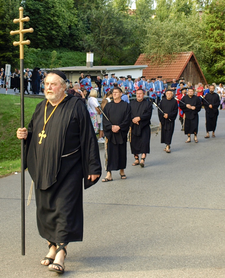 Za katem jdou rozvážným krokem soudci, opat a mniši paulánského řádu (Řád nejmenších bratří sv. Františka z Pauly), kteří v Brtnici kdysi působili. Následují bubeníci a schönbornští vojáci, kteří město během morové epidemie obklíčili a hlídali, aby nikdo nemohl ven ani dovnitř.