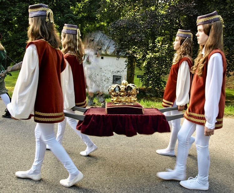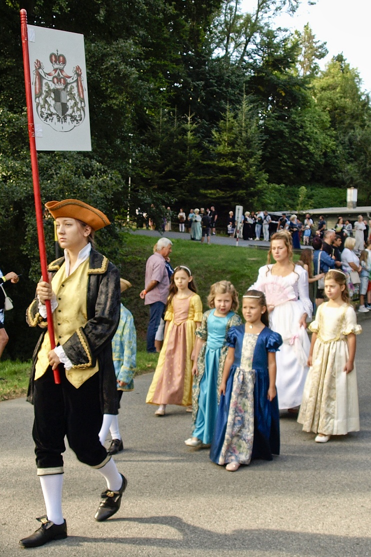 Poté vycházejí ze zámecké brány první postavy průvodu. Zvony vyzvánějí, bubny pochodujících vojáků temně znějí, trubači troubí fanfáry. V galerii najdete celý průvod chronologicky tak, jak šel městem.