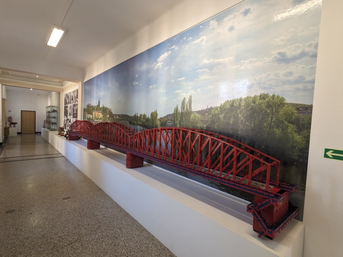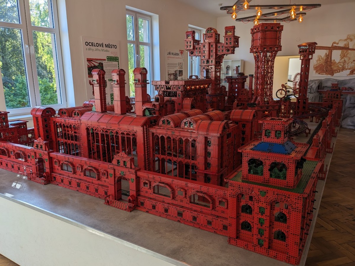 Za pokladnou muzea se vyjde do 1. patra, kde ihned upoutá dlouhý model pražského železničního mostu přes Vltavu na pozadí tapety okolí s Vyšehradem. Model je v měřítku 1:42 a má délku 7,5 metru. Vystavena je též poštovní známka s tímto mostem ze série Mosty vydané v roce 1978. Tento i další dva modely jsou dílem Jiřího Mládka. Celou místnost zabírá model Ocelového města. Ten začal Mládek tvořit v roce 2000 inspirován dílem Julesa Verna. Poslední část, secesní továrnu, dokončil v roce 2022. Model se rozkládá na ploše 25 m2, je kompletně sestaven výhradně jen ze součástek stavebnice Merkur, celkem 400 tisíc dílků a něco mezi 330 až 350 tisíci šroubků a matiček včetně pohyblivých částí, kolejí a vláčků, výtahů, jeřábů, věží, továren a dalších mechanických prvků, vše v duchu železné utopie. Model byl v roce 2009 zapsán do Guinnessovy knihy rekordů jako největší model vyrobený ze stavebnice Merkur. Dalším jeho modelem je visutá dráha ve Wuppertalu s vysvětlující textem historie této dráhy, která byla dána do provozu v Německu v roce 1901 a funguje dodnes. Následuje množství dalších merkurovských modelů – Eiffelova věž (Paříž), Tower Bridge (Londýn) a ruské kolo (za článkem je celkový pohled na modely i jednotlivé modely), motocykl Jawa 350 „Pérák“, pražský metronom na Letné, řetízkový kolotoč, modely pásových vozidel a u stropu jsou zavěšeny modely letadýlek. Akademie věd poskytla též Wichterleho přístroj sestavený ze stavebnice Merkur, na kterém vyrobil poprvé kontaktní čočky. A tak by šlo jmenovat další a další vystavené modely. Také jsou vystaveny původní krabice stavebnic Merkur. Za článkem je ukázka stavebnice z roku 1947. V jedné z místností jsou vystaveny pohyblivé robotické modely využívající již prvky čidel a moderní digitální techniky.