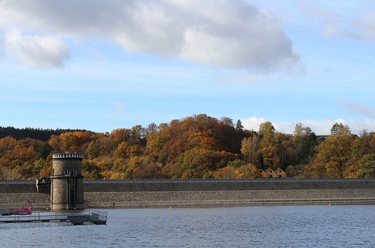 Ve sváteční úterý 28. října po desáté dopoledne jsme vystoupili z autobusu na zastávce Luhačovice - Nad přehradou. Toto místo bylo pro nás úplně neznámé, přece ale, když jsme byli nad přehradou, tak ona musí být dole pod námi. Proto jsme se vydali pěšinkou dolů přes krásně barevný listnatý les. Prošli jsme okolo zavřeného koupaliště, a narazili jsme na cyklostezku, která vedla po pravém břehu přehrady.