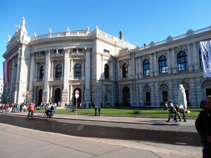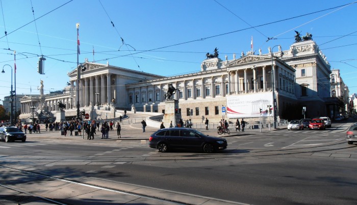 Přicházíme na náměstí Heldenplatz. Zde právě probíhá slavnostní vojenská přehlídka a přísaha vojáků. Ač se jedná o neutrální stát, přesto mají armádu. Vojáků je zde opravdu spousta. Přísahy se má zúčastnit i prezident. Toho bohužel přes obrovský počet návštěvníků nemáme možnost vidět. Dereme se množstvím lidí dále. Docházíme k budově Parlamentu. Rádi bychom se podívali dovnitř. Dlouhá řada lidí stojící před námi nás od toho trochu odrazuje.To nemůžeme stihnou. Lidí před námi je nejmíň tisíc. A to jen slabým odhadem. To bude trvat celou věčnost, času moc nemáme. Jak se ale pleteme! Po asi 15 minutách jsme v budově. Velmi dobrá organizace. Před vstupem koukáme na fontánu a sousoší, znázorňující bohyni moudrosti. Pomalými kroky  se procházíme vznešenou budovou, stojící ve středu města.