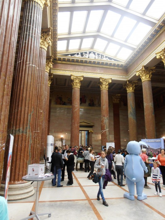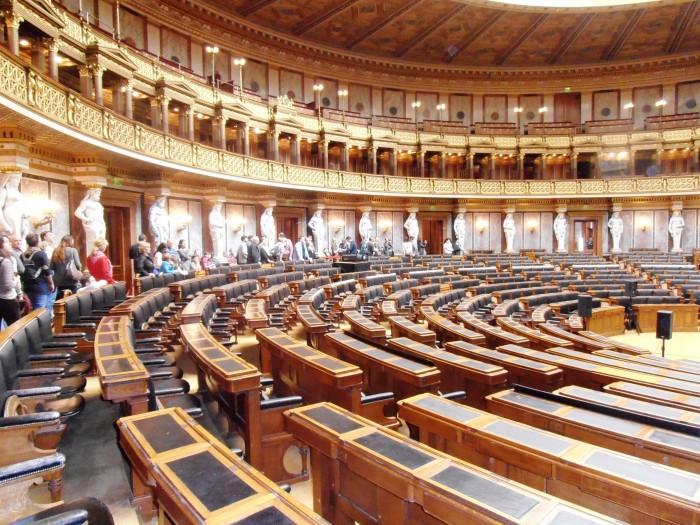 Máme možnost nahlédnout všude. Hned u vstupu vidíme Sloupovou halu, která mi připomíná turecké památky. Vcházíme do dalších místností. Dolní komora, kde zasedá Národní rada Rakouska, Horní komora, kde se schází Spolková rada země. Vcházíme i do kanceláře prezidenta. Ta je  letos otevřená pro běžné návštěvníky  už po osmé. Prezident měl návštěvníky také osobně vítat.My toto štěstí nemáme. Nevadí. Zážitků máme spoustu.A také fotografií,protože právě v tento den bylo povoleno i fotografování. Další kroky nás vedou do parku, kde se kocháme pohledem na krásně rozkvetlé růže,na úžasné sochy, zajímavě řešené trávní plochy.…