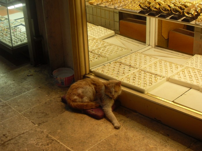 Kromě spousty lidí se mi pletou pod nohami kočky. Nebojí se, nikdo jim neubližuje. Jsou zvyklé na obrovský ruch. Některé zcela nerušeně spí. Zajímavá podívaná. Nesčetné množství  zlata, koberců, mističek, kabelek, čajů, zeleniny….