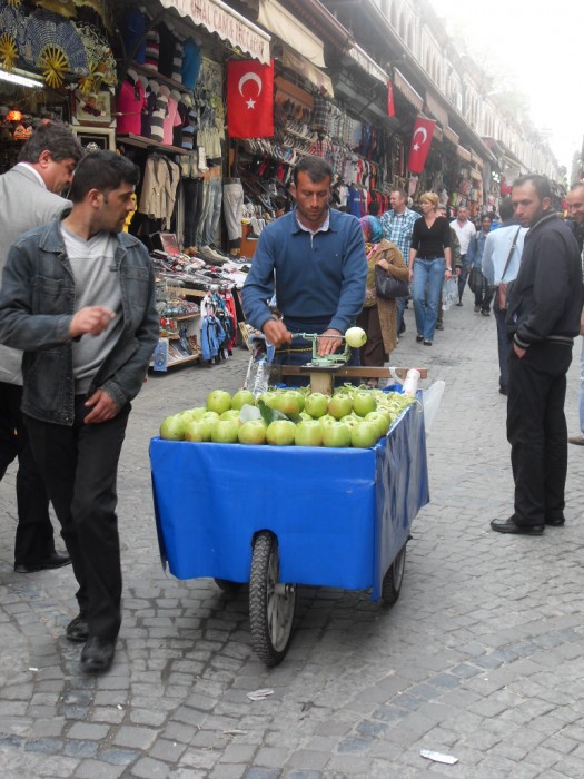 Obdivuji chlapce s vozíkem jablek. Na vozíku má připojený jakýsi krouhač. Nasadí jablko, zatočí kličkou, jablko je oloupané a nakrájené na kolečka. Chlapec je uchopí do ubrousku a výměnou za peníze s úsměvem podává.