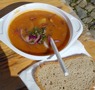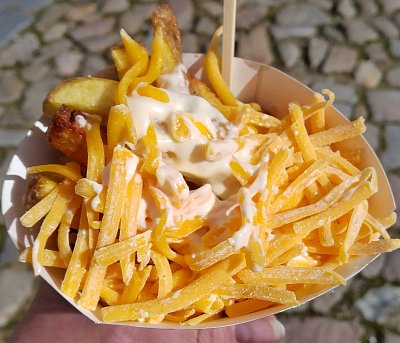 Já zahnala velký hlad vynikajícím bramborovým guláškem s pikantní klobáskou a kornoutem belgických hranolků s domácí česnekovou omáčkou a čedarovým posypem. Kdo neví, jaký je rozdíl mezi normálními a belgickými hranolkami (jako já), tak v tom, že tyto byly z belgických brambor (prý). Nevím, nepoznala jsem to, ale pochutnala jsem si :-)) Moc :-)