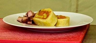 Milovníkům brambor a nových receptů si dovoluji doporučit jednoduchou a efektní bramborovou roládu s dušenou mrkví a restovaným uzeným masem.