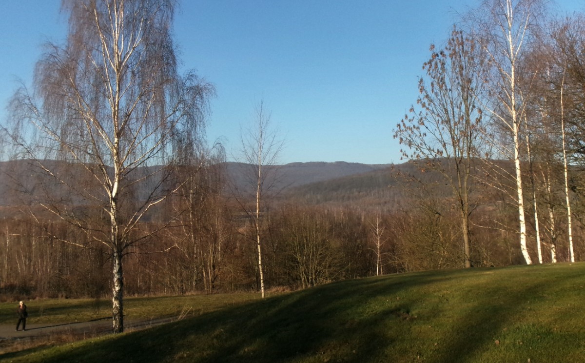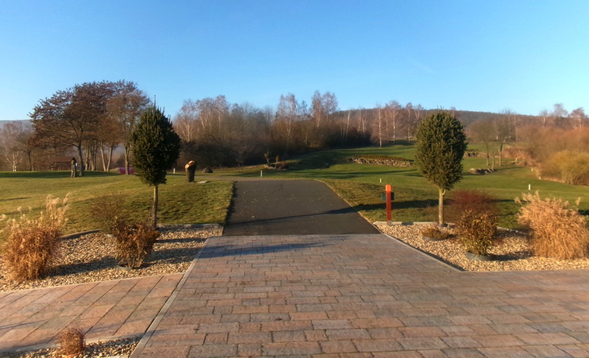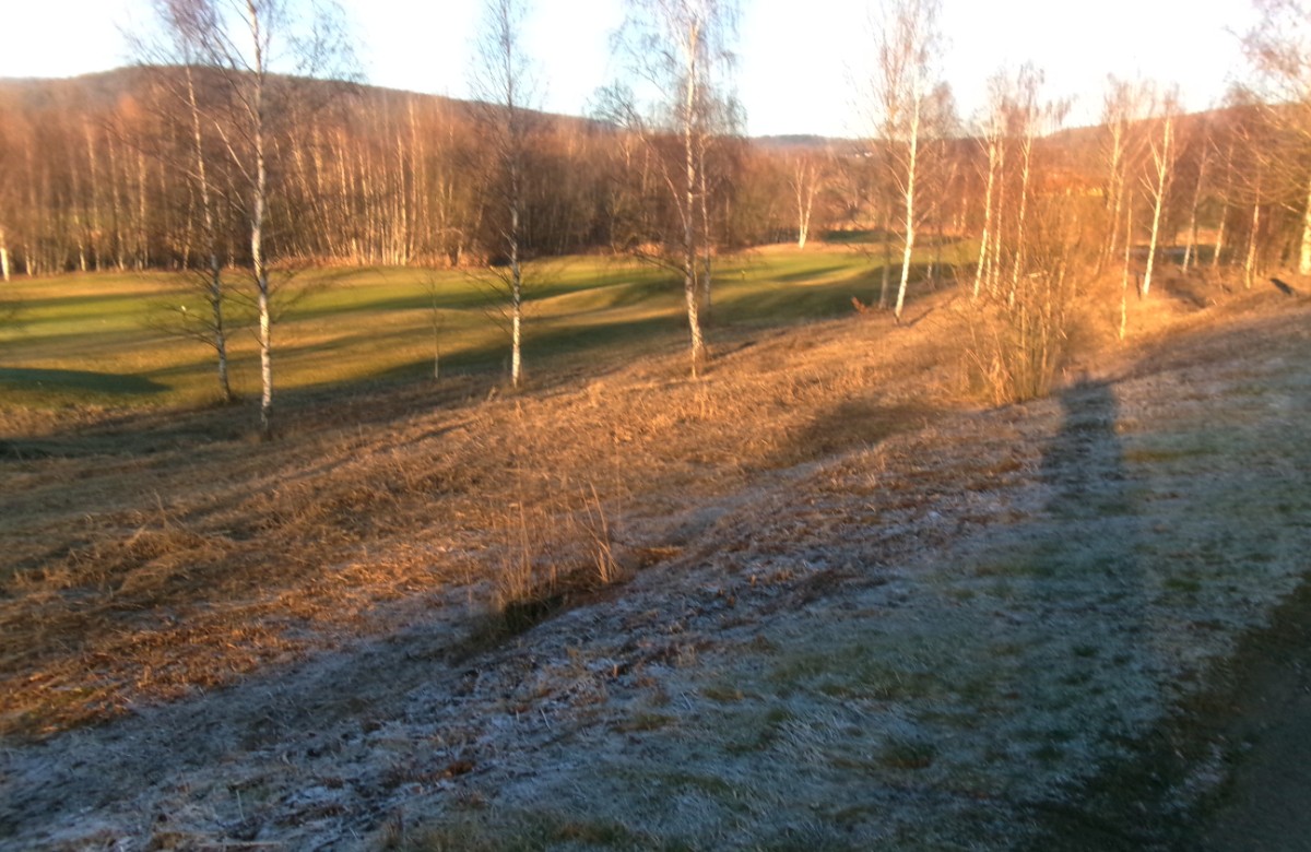 A tak jsme po obědě a kávě nasedli do auta a hurá na golf. Byli jsme tam sami, celou dobu nad námi létala letadla z blízkého letiště. Trávníky byly bílé od mrazivé noci, ale po silnici se dalo v pohodě chodit. Postupně jsme potkávali další návštěvníky kteří měli stejný nápad jako my a měli s sebou pejsky. Pár jsem si jich pohladila a přiznávám, že mi bylo tak trochu smutno, připomělo mi to naše dva psí miláčky. Byli jsme rádi, že jsme se v pohodě prošli, zima se umoudřila, slunce dodalo trochu tepla. Počet návštěvníku se zvyšoval, stejný nápad mělo více lidí. My jsme se pomalu vraceli k našemu autu.