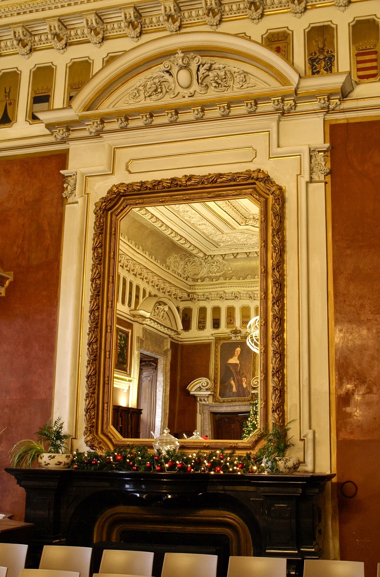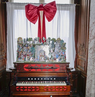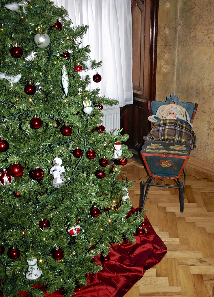 Reprezentativnímu a bohatě zdobenému Rytířskému sálu v prvním patře empírového křídla zámku vévodí vysoký vánoční strom i s dárky (horní snímek) a 170 let starý dřevěný betlém.