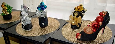 Největším lákadlem pro děti je však Popelčin kočár (snímek nahoře). V pozadí za ním se skví tři vánoční stromečky v barvách jejích šatů - růžový plesový, bílý svatební a poslední s mysliveckými ozdobami. Na dolním snímku jsou vyzdobeny Popelčiny taneční střevíčky.