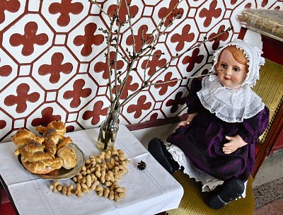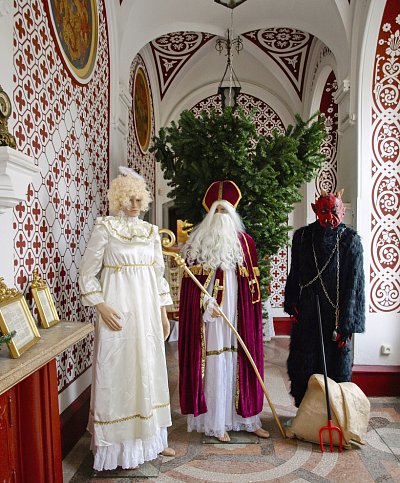 Výstava začíná seznámením s duchovními tradicemi i pohanskými zvyky. Na snímku vlevo panenka, představující sv. Barboru i s větvičkami třešně, vpravo Mikuláš s andělem a čertem. K vidění jsou i sv. Ambrož a sv. Lucie.