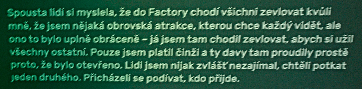 Vystoupali jsme do třetího patra, kde se nachází terasa s výhledem na Týnský chrám. Nevím, co si prohlížet dříve. Ze všech koutů na mne doléhá kult Ameriky šedesátých let. Ocitám se uprostřed ateliéru The Factory, centru nezapomenutelných večírků a setkávání intelektuálů, dramatiků, hollywoodských celebrit, mecenášů, ale i bohémů ,z ulice'. (Citát Andyho Warhola o tomto ateliéru v galerii). Barvy, obrazy, hudba, plakáty ... Jde mi z toho hlava kolem ...