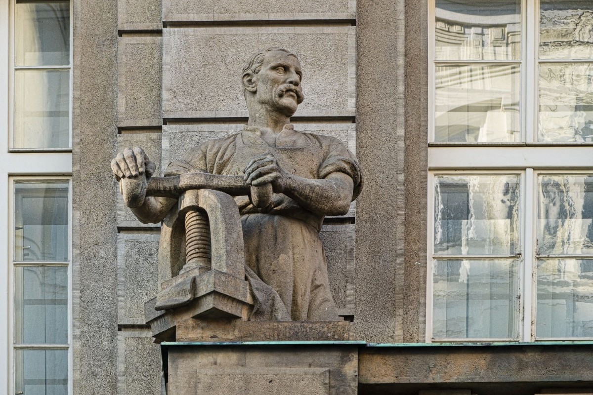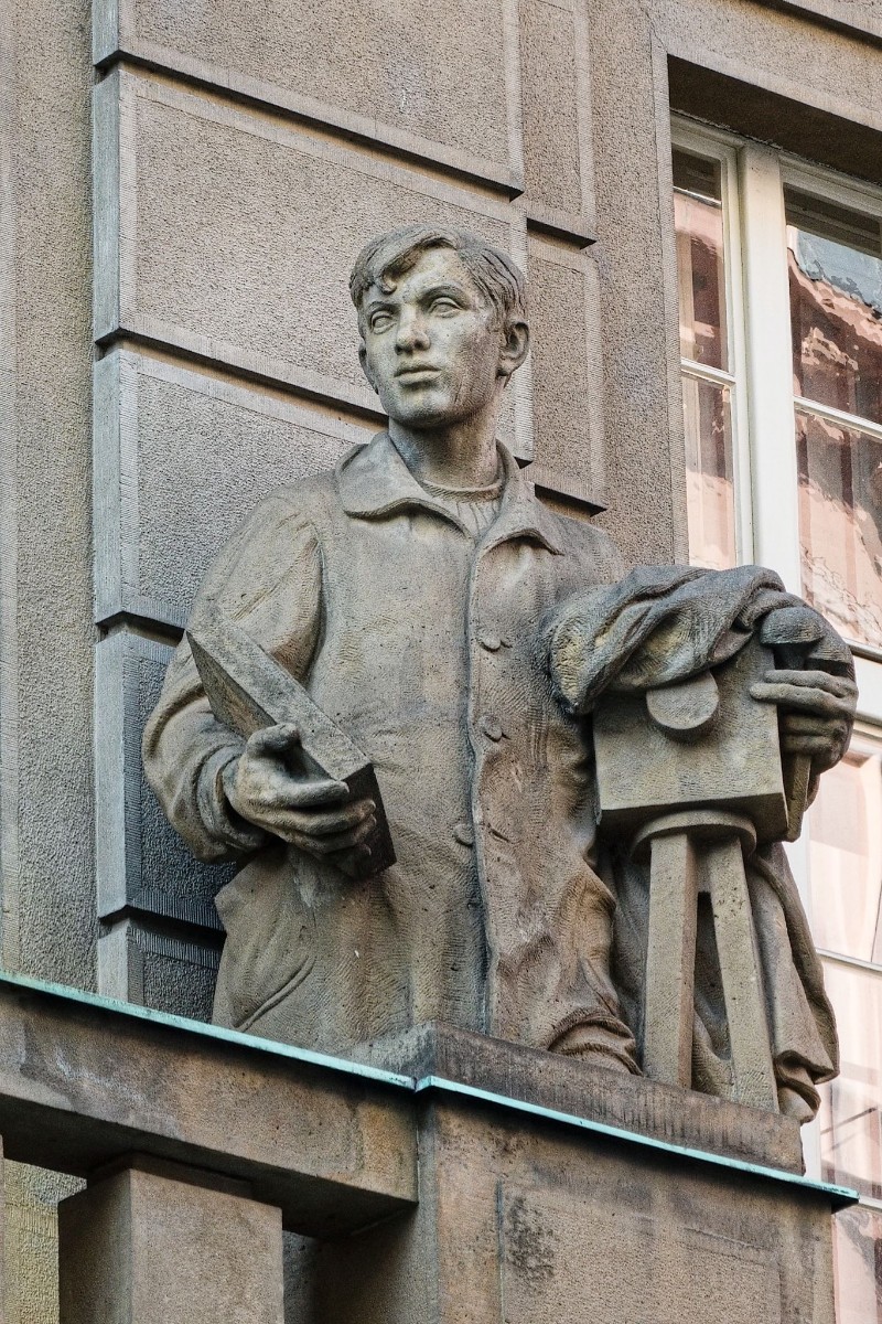 Státní tiskárna cenin, arch. Josef Sakař a František Klokner, 1924-1928 - Praha 1, Růžová 943/6 - hlava Republiky a postavy tiskaře a fotografa.