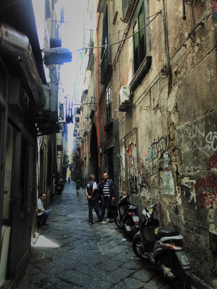 Historické centrum se svými úzkými uličkami. Typickými neapolskými uličkami. Úzkými, kde je občas vyvěšené prádlo, kde se dá nahlédnout v přízemí dovnitř, neboť dveře jsou dokořán. Slyším volání z jednoho konce na druhý, vzkazy, pozdravy. Pouliční zpěváci, prodavači nabízejí dva rohy plodnosti pro štěstí za 1 Euro. Číšník před restaurací vás zve dovnitř a na náměstí carabinieri vše sledují. To vše patří k atmosféře tohoto města.