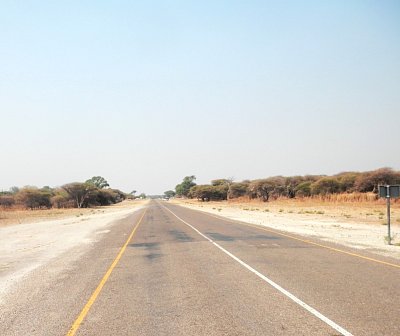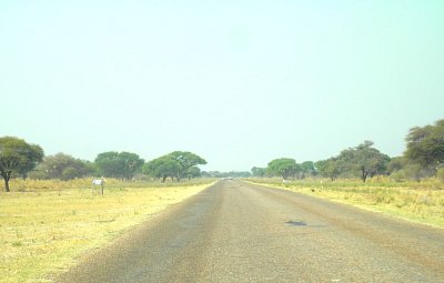 Po obou stranách se rozprostírá plochá, vyprahlá pustina, kde se tráva mění v šedozelené chomáče a akácie lemují vozovku.