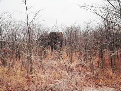 Později jsme vjeli do porostu vegetace. Poslední úsek byl nejsložitější, kola terénního auta se bořila do sypkého písku. Vidíme první zvířata, konkrétně slony.