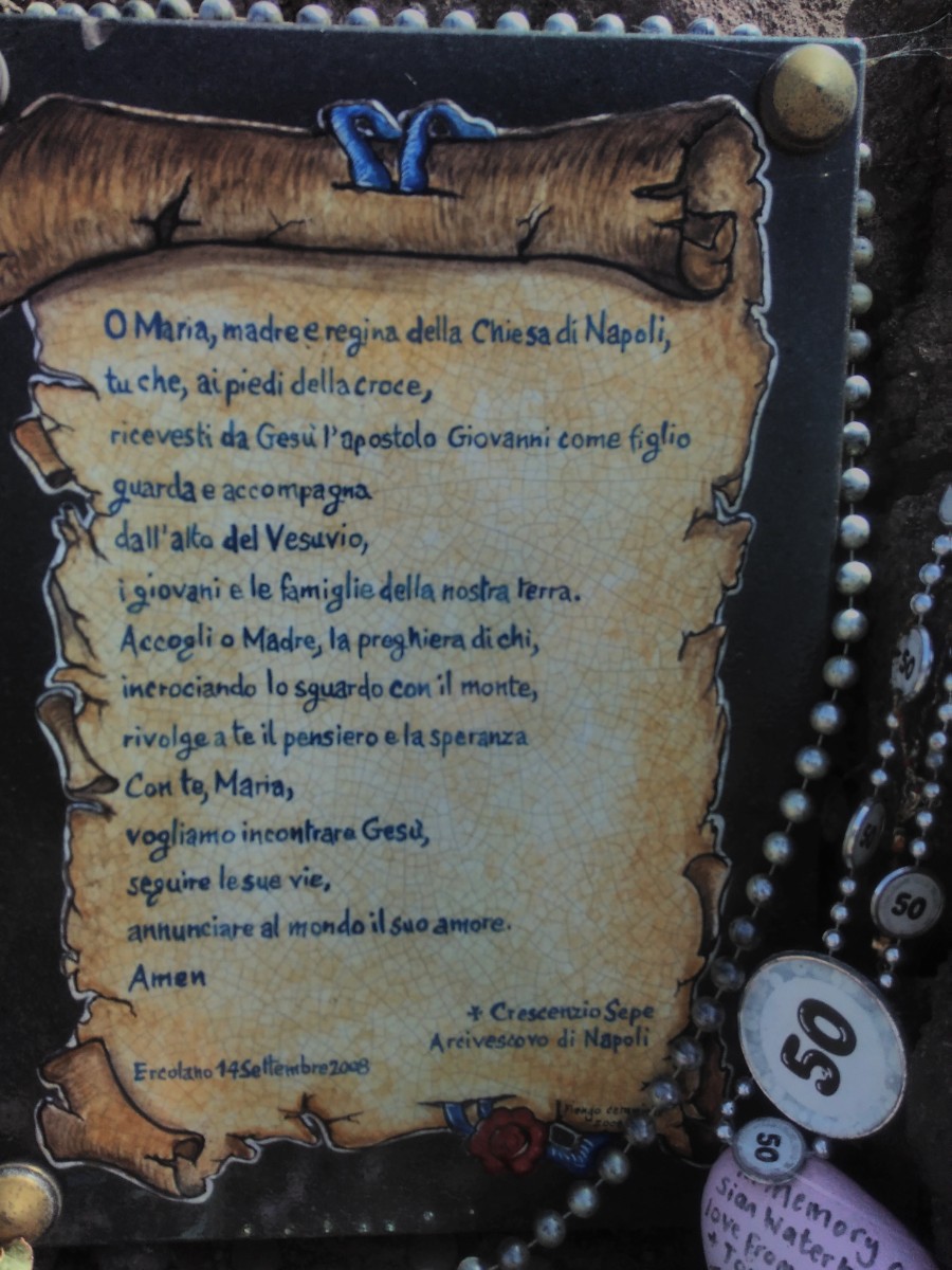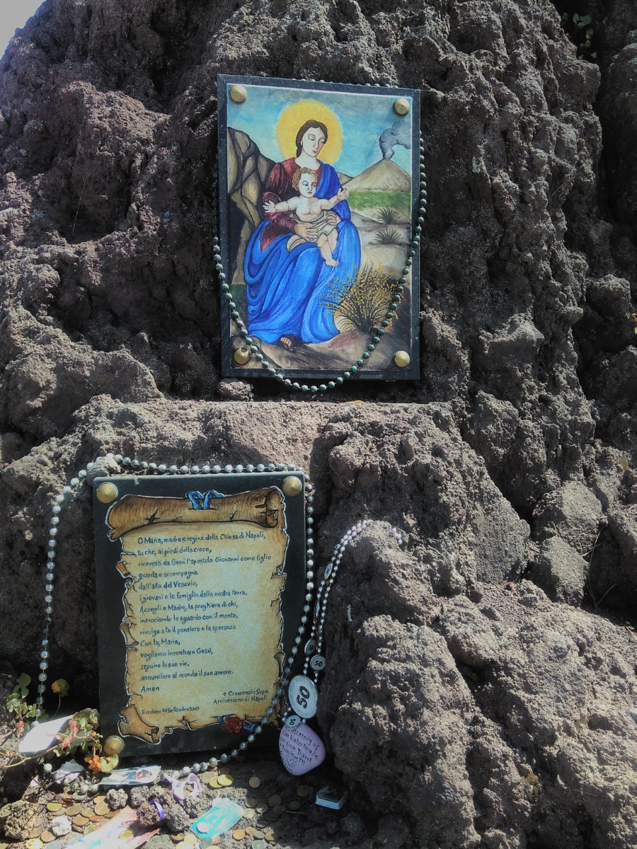 Nahoře je stánek se suvenýry. Kupuji slůně s chobotem nahoru (jedině ty prý nosí štěstí) a Madonu pro ochranu z lávového kamene. A dárky pro známé. Prodavačka je velmi milá a přátelská. Ostatně jako všichni Kampánci.