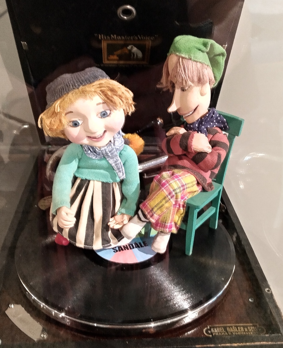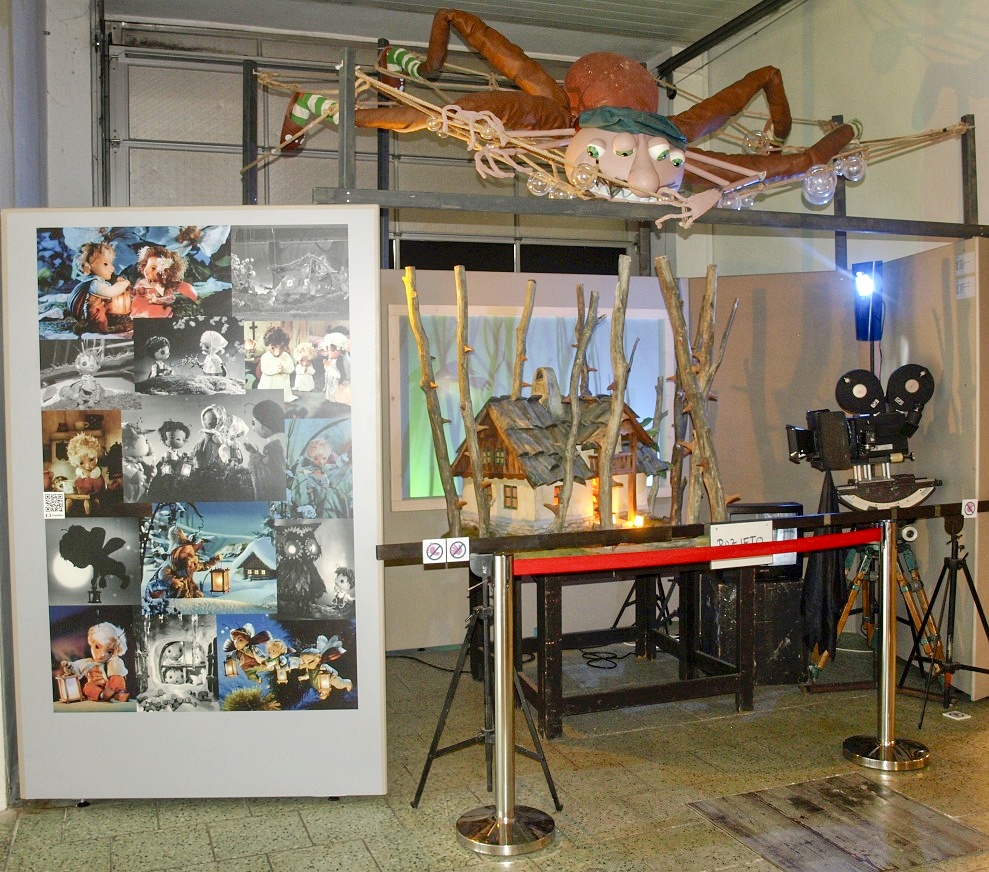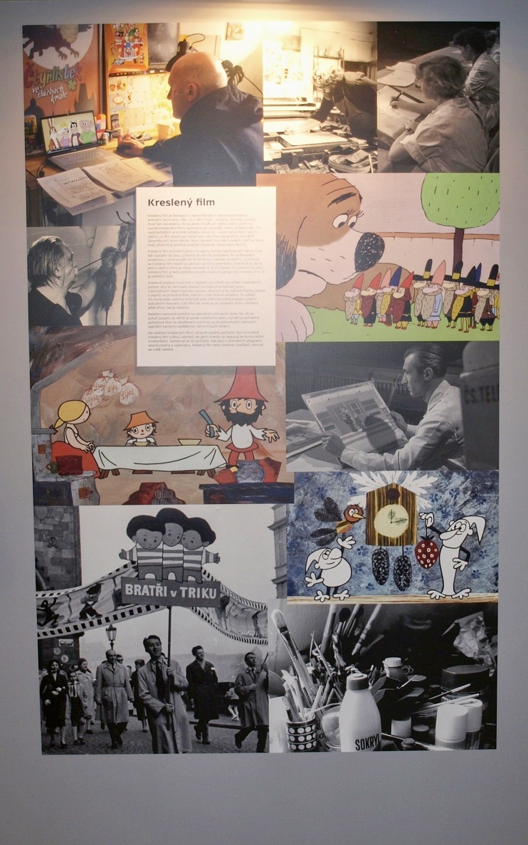 Ve výstavních vitrínách naleznou návštěvníci velké množství artefaktů, od originálních loutek z pohádek (v galerii) přes ukázky filmových pásů či některých krátkých reprodukcí televizního pořadu Večerníček. Vlevo na snímku dnes už téměř nesehnatelná kniha, vpravo návrh oblečení táty Josefa z osvětového večerníčku Povídání o mamince a tatínkovi.