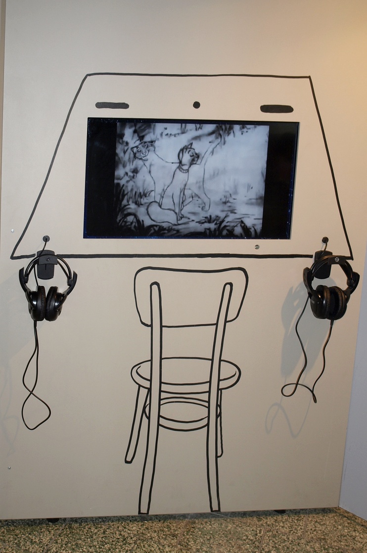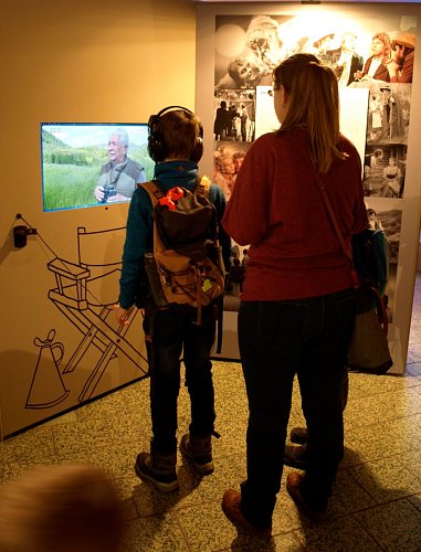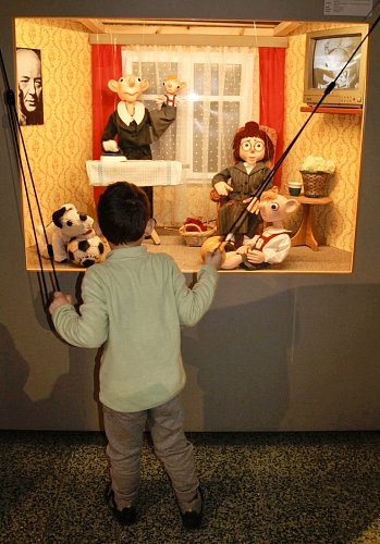 Díky interaktivním prvkům se chlapeček na snímku stal na chvíli loutkohercem. Pomocí jednoduchých táhel cvičí pravou rukou s Hurvínkem, zatímco díky jeho levé ruce žehlí taťka Spejbl prádlo :-) Vpravo ukázka ruchového studia, kde se dodatečně nahrávají zvuky, které nejsou dostatečně zachyceny během vlastního natáčení. Například zvuky oblečení (šustění kabátu, zip ..), kroky na dlažbě, klapot kopyt, vítr a podobně.