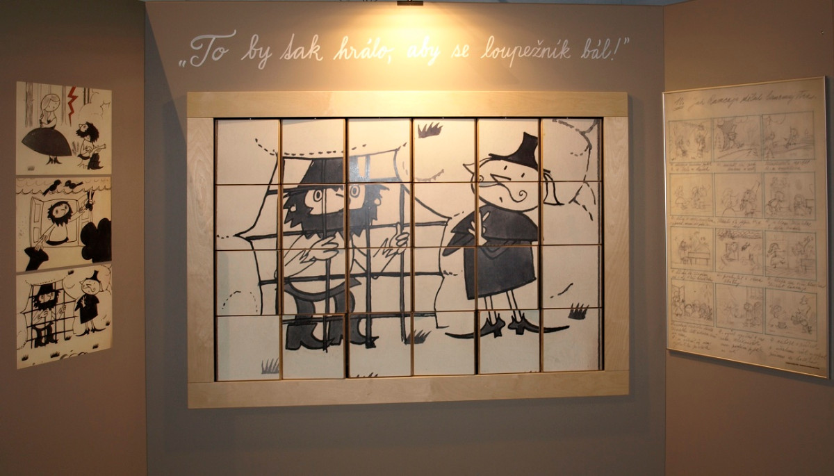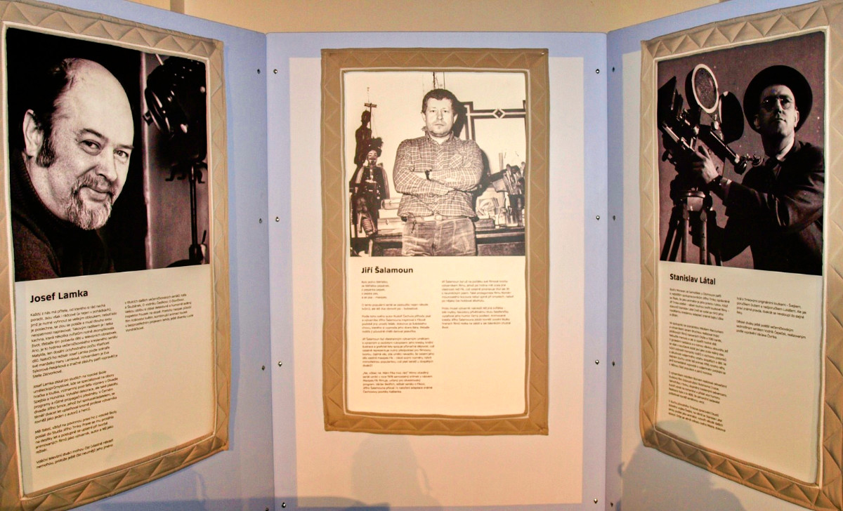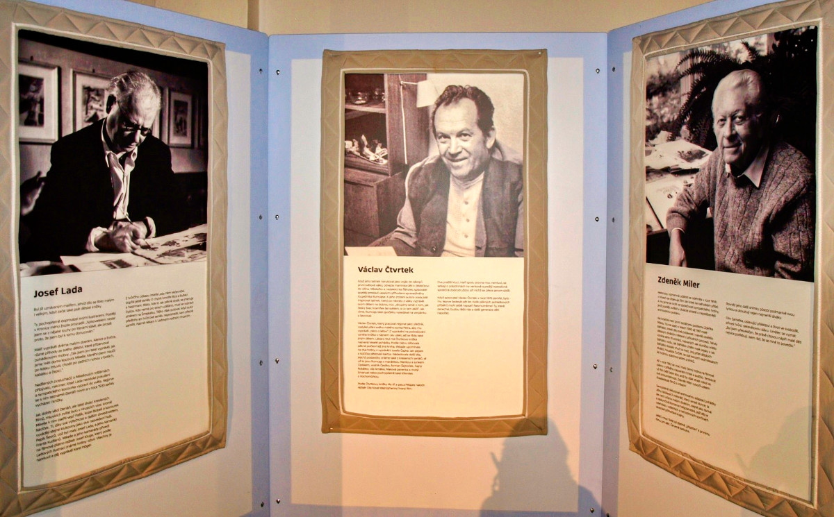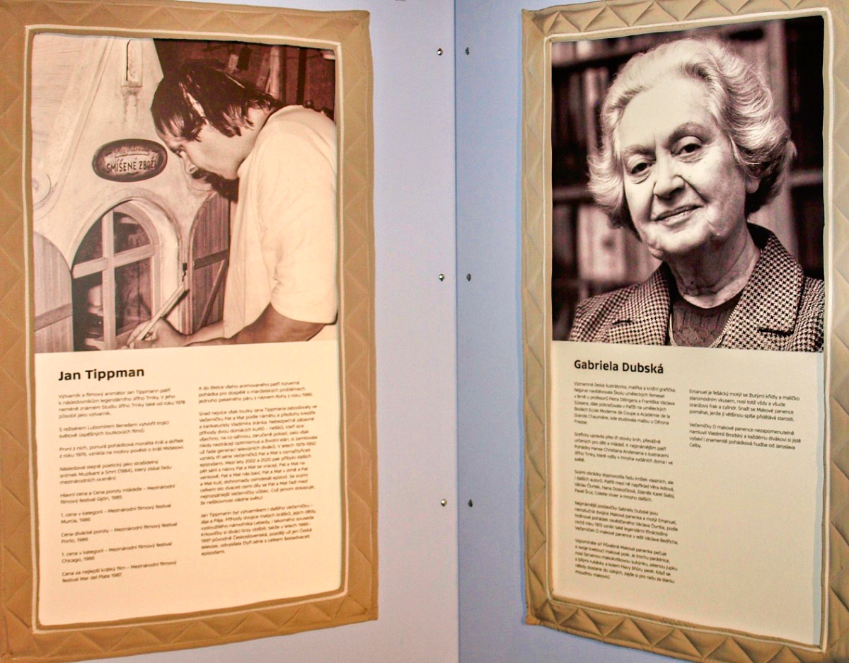 Na několika výstavních panelech se návštěvníci výstavy seznamují s osobnostmi, které se na vývoji večerníčkových pohádek podílely mnoho let. Zleva režisér, výtvarník a scénárista Zdeněk Smetana, výtvarník a ilustrátor Adolf Born, výtvarník a filmový animátor Jan Tippman a ilustrátorka, malířka a knižní grafička Gabriela Dubská. Další ve fotogalerii.