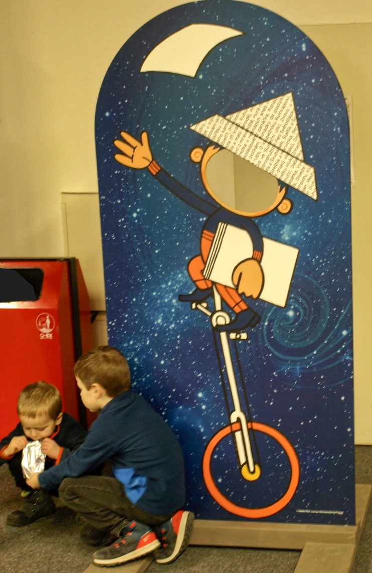Velcí i malí návštěvníci si mohli z papírů s logem České televize složit večerníčkovskou čepici (vlevo) a vyrazit na prohlídku. Vpravo panel, přibližující tvorbu hraných večerníčků. Bližší informace bylo možné získat v obrazových a zvukových smyčkách pomocí sluchátek, které byly u všech panelů. Další zajímavé panely ve fotogalerii.