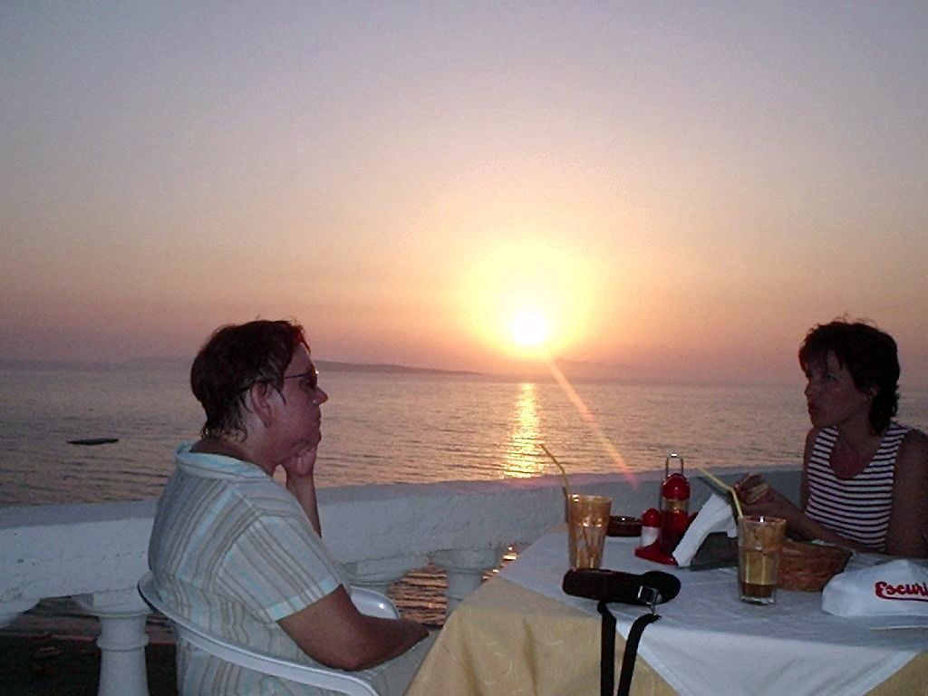 Korfu, letovisko Agios Stephanos. Příjemné zakončení dne na terase kavárny Evinos.