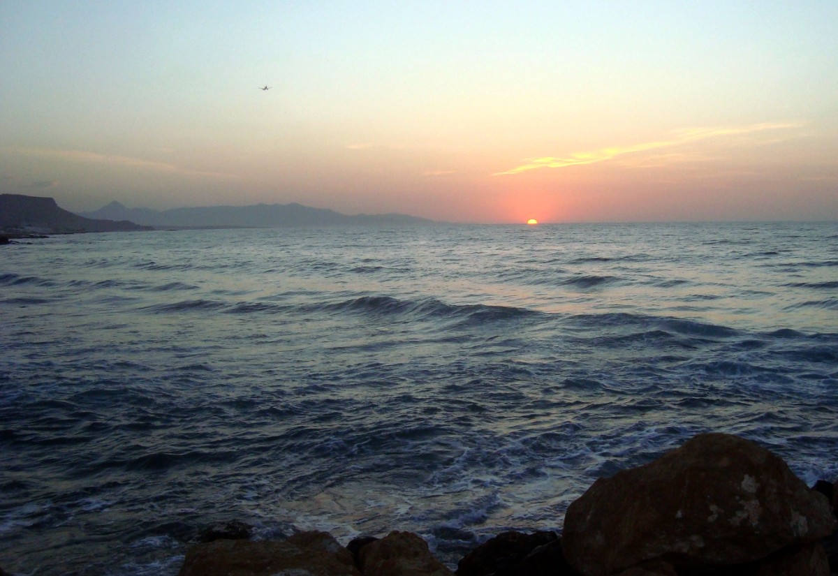 Kréta. Kotouč slunce mizí za obzorem a moře mění barvu.