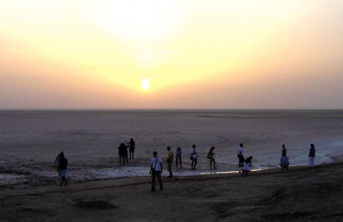 Tunis. Západ slunce nad velkým solným jezerem Chott el-Jérid