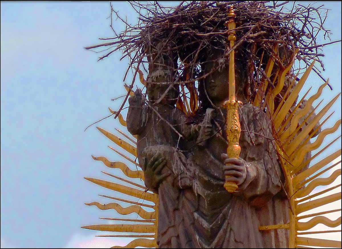Broumovský morový sloup s čapím hnízdem, jaro 2025