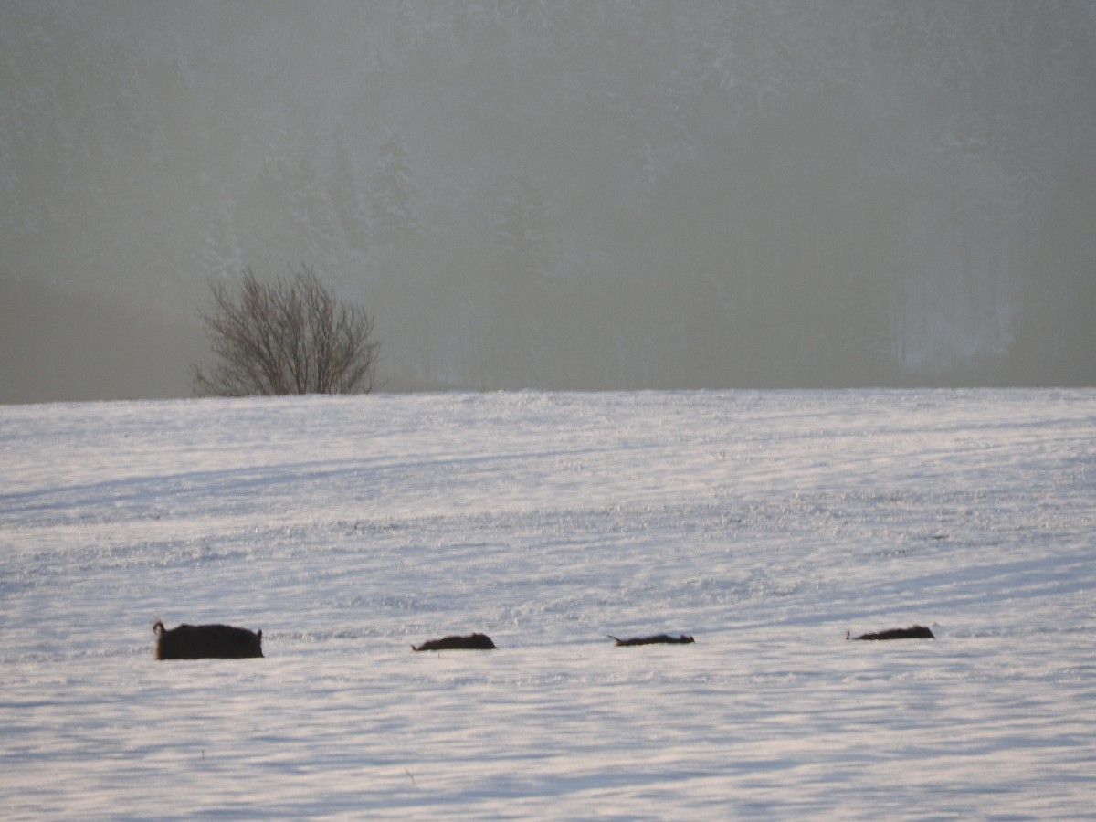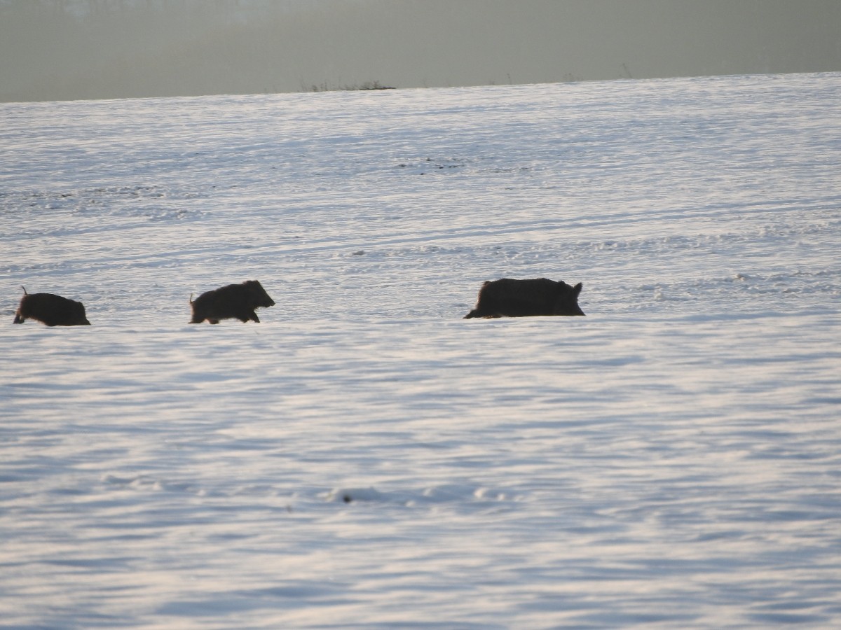 Při cestě kolem Vinného mezi Třebušínem a Ploskovicemi se na bílé pláni na obzoru objevila řádka běžících divočáků. Ve chvíli, kdy jsem čekala, že se ukážou pořádně, tak bohužel zmizeli na terénní vlnou. Proběhli remízkem a za stromy se hnali k silnici. Nestihla jsem doběhnout blíž, abych je na silnici zachytila. Pro mě to byl zážitek, jaký se asi nebude opakovat. Protijedoucí auto stačilo naštěstí zastavit.