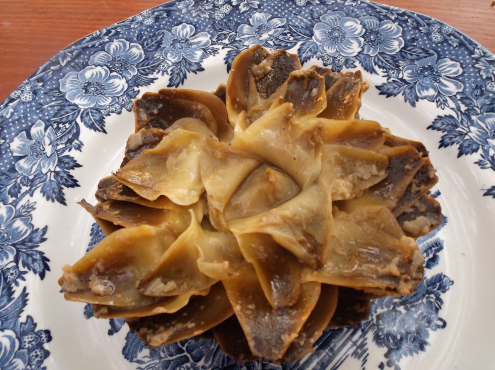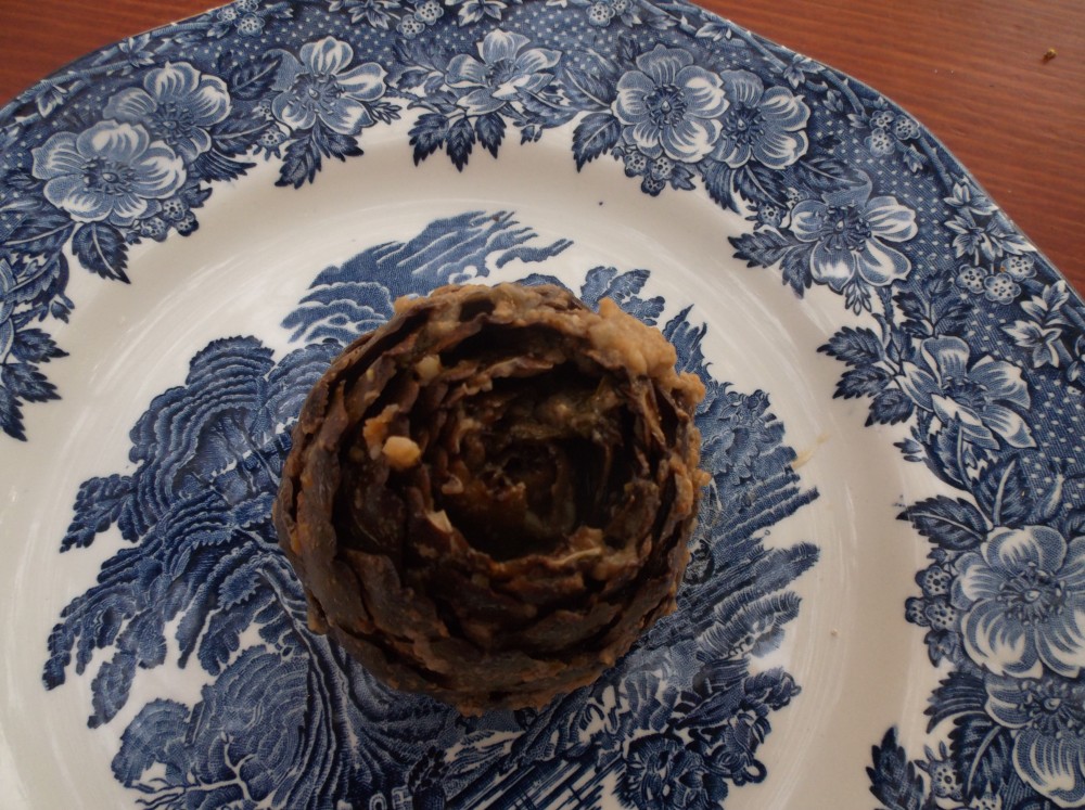oddělené lístky odkryly srdíčko - to se může polít kapkou olivového oleje a rovnou si na něm můžete pochutnat, nebo dále použít k další úpravě, já to většinou nevydržím a hned sním...:) a vy?
