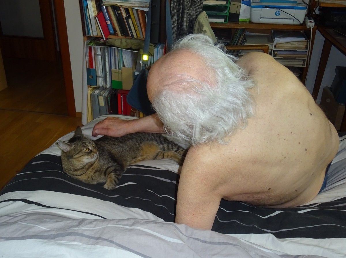 Podívala se, co píšu, a uvelebuje se vedle mě na posteli. Provádí večerní očistu. (Páníček pracuje o dva metry dál na notebooku.)