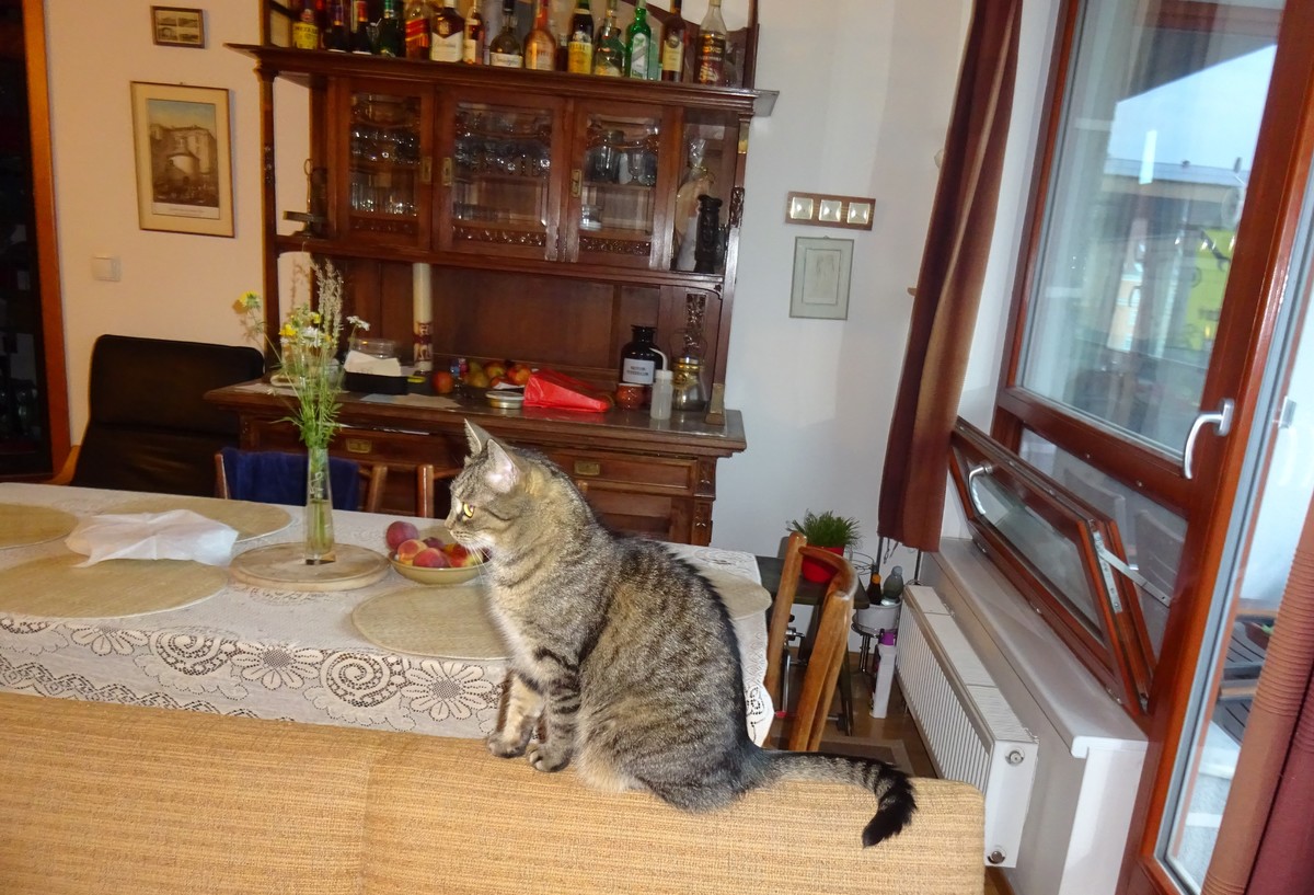 Po jídle uléhá v obýváku na opěradlo křesla blízko svačícího páníčka. (Začínám péct koláč.)