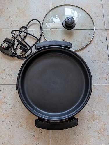 Nabízím tuto pánev podle všech vyobrazení (viz i štítek), nepoužívaná, plně funkční. Průměr 31 cm, hloubka 5 cm, příkon 1400 W. Lze zaslat též poštou nebo přes balíkovnu za úhradu nákladů.