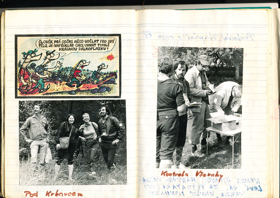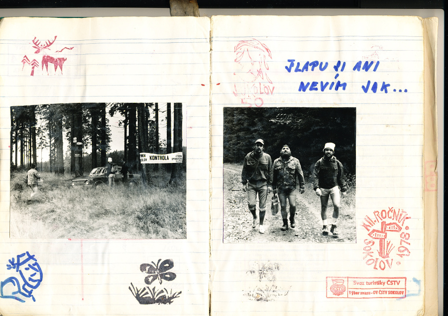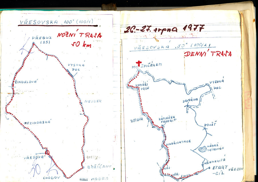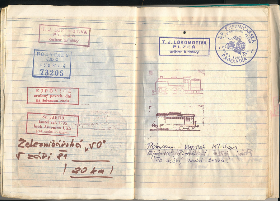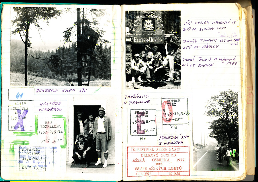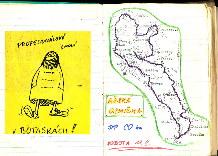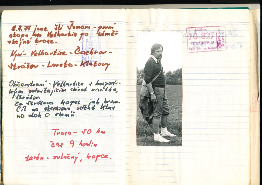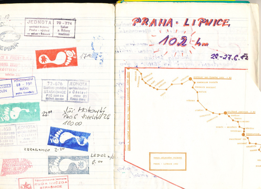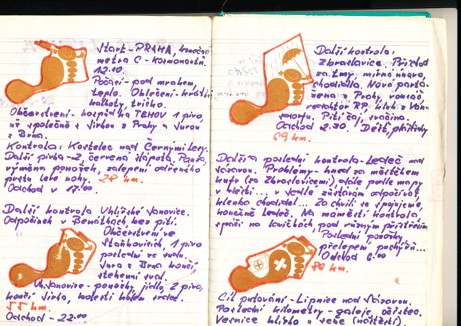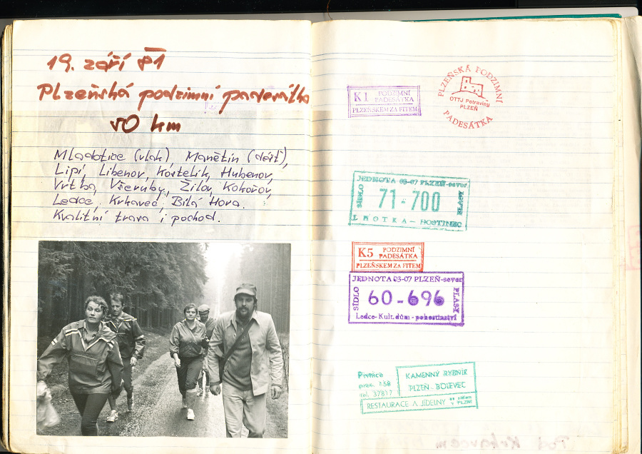 Od roku 1977 jsem na všechny dálkové pochody tahal kromě téměř dvoukilového fotoaparátu Zenit E taky sešit v tuhých deskách formátu A5, abych do něho zapisoval dojmy z pochodů, proložené fotkami a razítky z míst, kudy trasy padesátek vedly. Ty nejzajímavější stránky jsem vybral jako svůj retropříběh - snad zaujme.