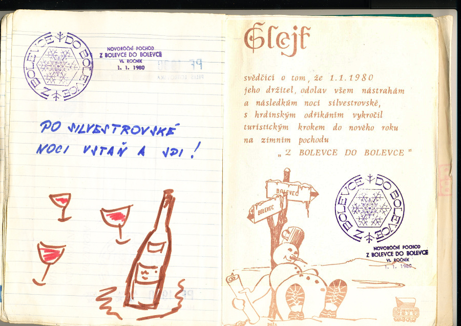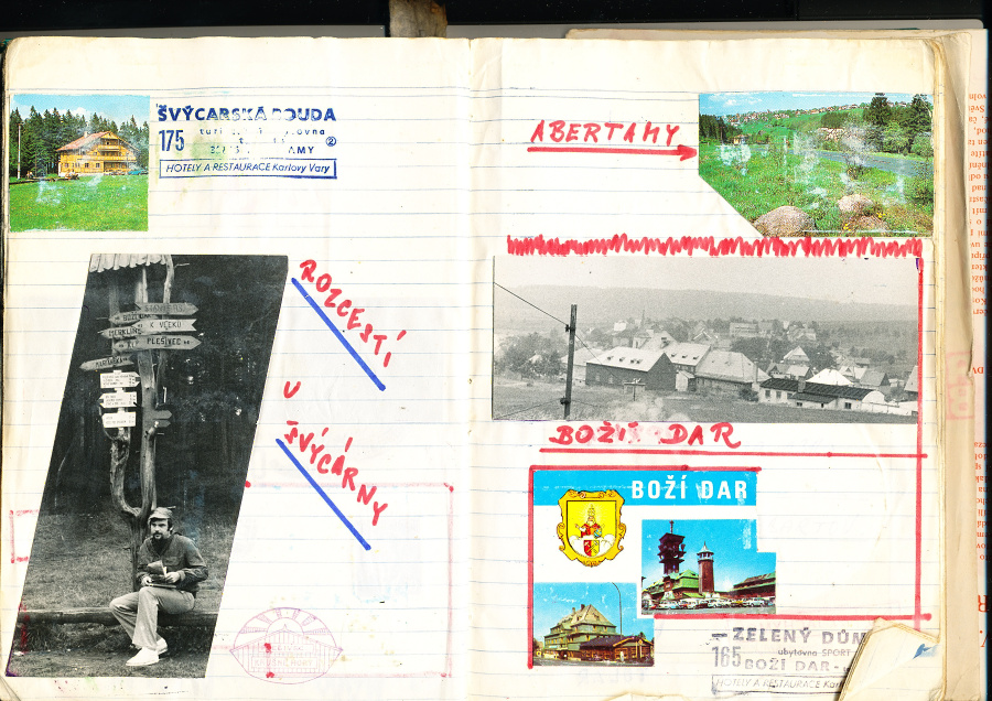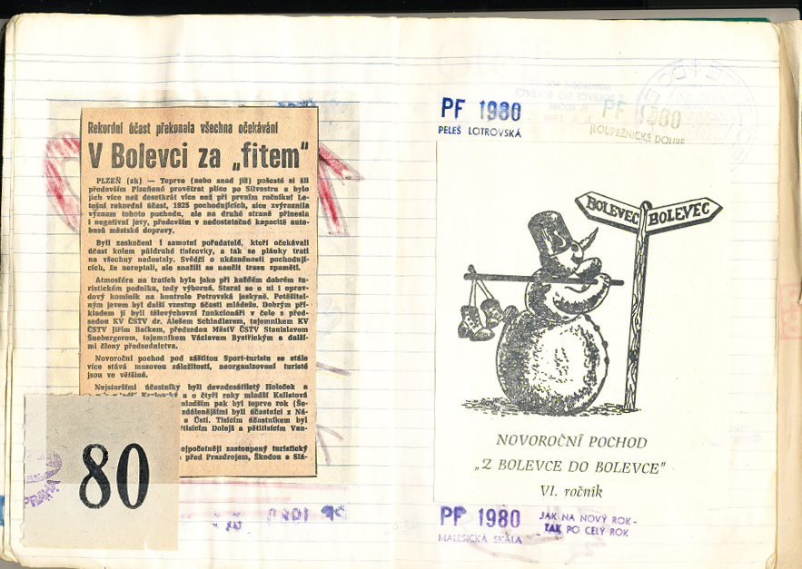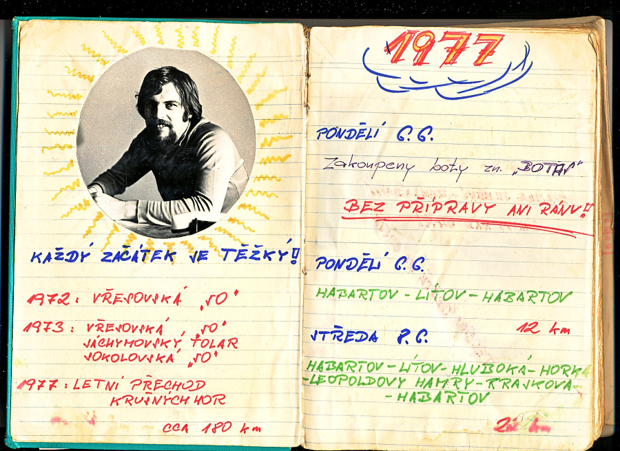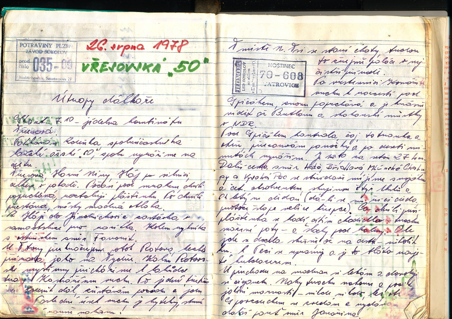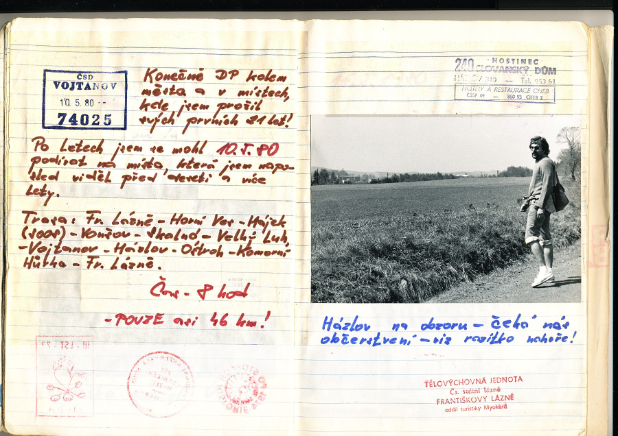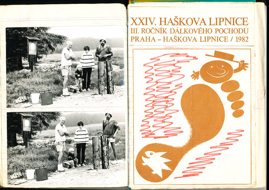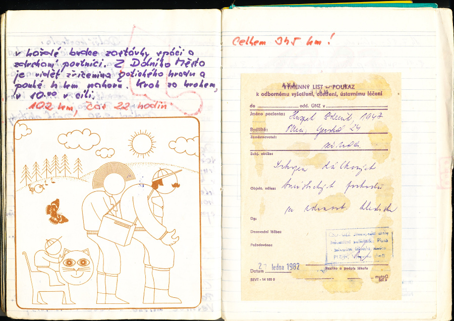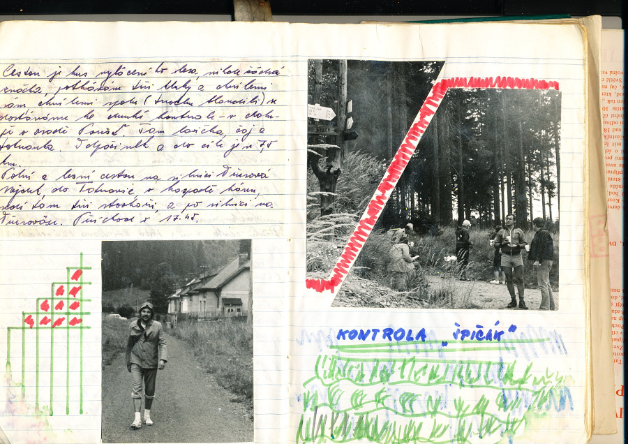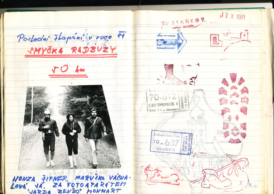 Od roku 1977 jsem na všechny dálkové pochody tahal kromě téměř dvoukilového fotoaparátu Zenit E taky sešit v tuhých deskách formátu A5, abych do něho zapisoval dojmy z pochodů, proložené fotkami a razítky z míst, kudy trasy padesátek vedly. Ty nejzajímavější stránky jsem vybral jako svůj retropříběh - snad zaujme.