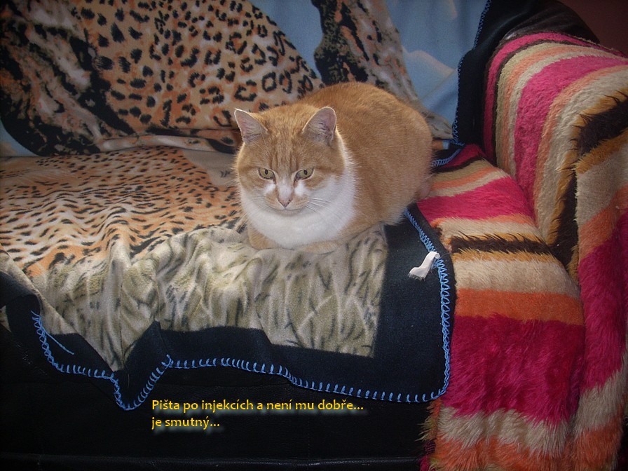 Začátkem ledna 2014 milý kocour začal zvracet. To se stává, ale když to bylo opakovaně, jeli jsme na veterinu. Padlo podezření na otrávenou myš. Dostal protijedové injekce v domnění, že vše bude dobré. Ale kdepak, přidalo se k tomu kulhání, takže další injekce a po týdnu se stav zdál stabilizovaný. Ale opět přišlo zvracení, kulhání, nadměrné pití vody, a tak jsme léčili antibiotiky, to již byl konec března. Pišta soustavně zvracel nestrávené granule.