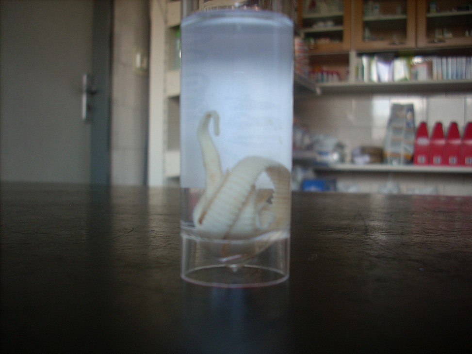 Lidé milí, vy,  kteří máte zvířátka jako členy rodiny, tušíte, jak mi bylo. Prý si mám zavolat kolem poledne. Volám – nic, prý ve 14 hodin, neb je ještě pod narkózou. Nevydržela jsem a jela do Holic na kliniku, kde dělali operaci. Těžko někdo uhádnete, co z něho vyndali. Tasemnici! Tasemnici, kterou doktoři naložili do lihu jako výukový materiál pro studenty. Neuvěřitelně velká tasemnice, jakou mívají prasata!