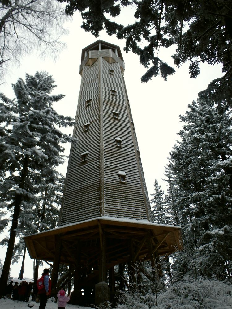 Po snídani vyrážíme poslední den v roce na rozhlednu Na Sedle. Vrchol Sedlo je asi šest kilometrů od Sušice, je 902 m vysoký a do šedesátých let minulého století na něm byla vojenská hláska. Na začátku 21. století se skupinka nadšenců rozhodla vybudovat zde rozhlednu.