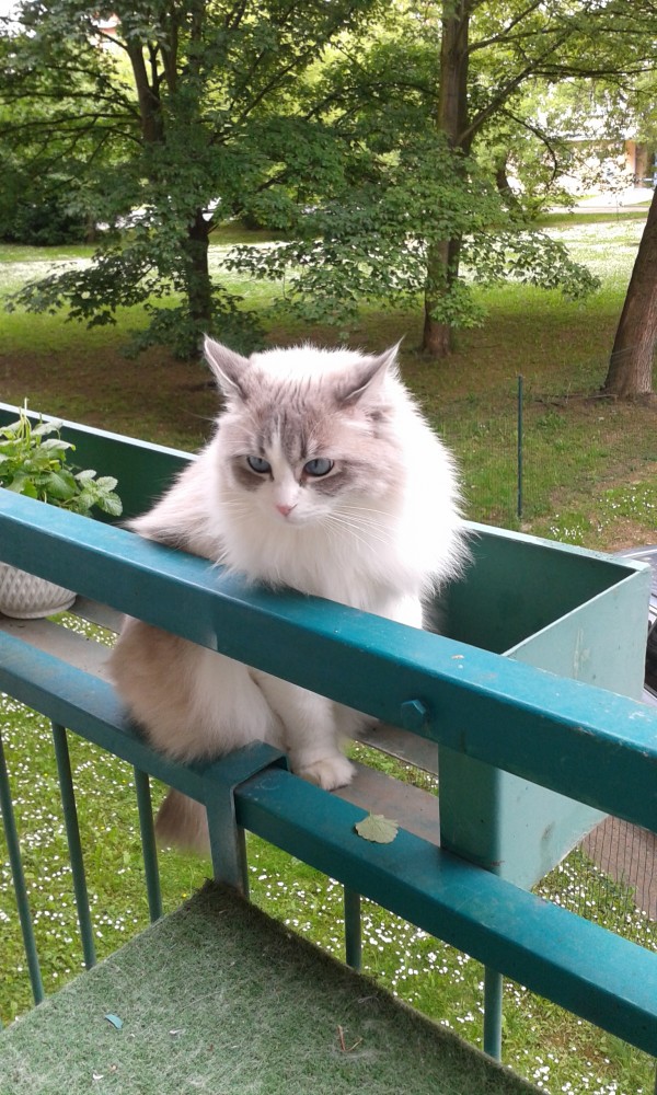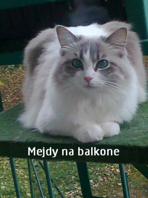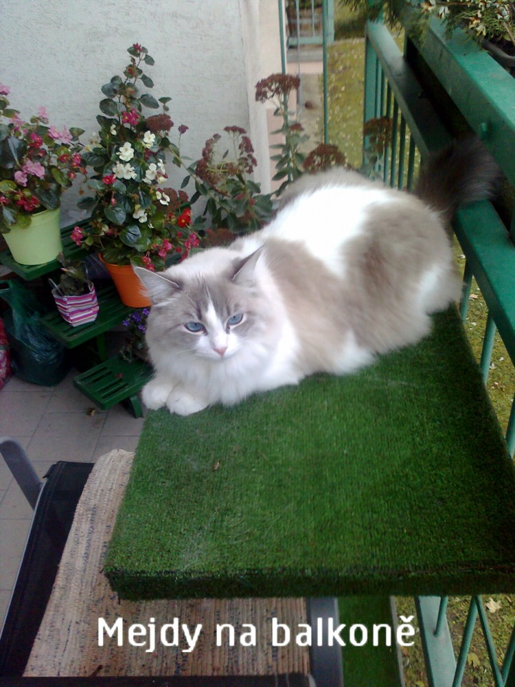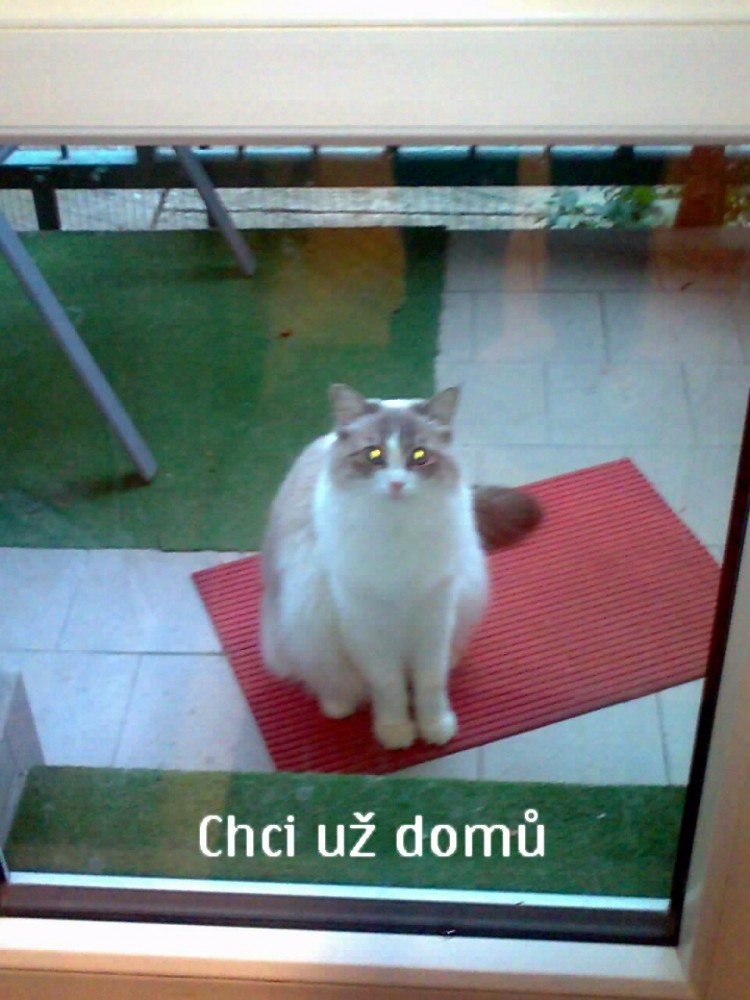 V podvečer jde na procházku na balkon, kde má přichystaný kulturní program: sleduje hnízdo jiřiček pod střechou, co je u nich nového, jak jim rostou mláďata, občas zažene drzého vrabčáka a pak vleže sleduje, jak já v kuchyni vařím večeři. To si nenechá ujít, protože vždycky něco dobrého "ukápne".