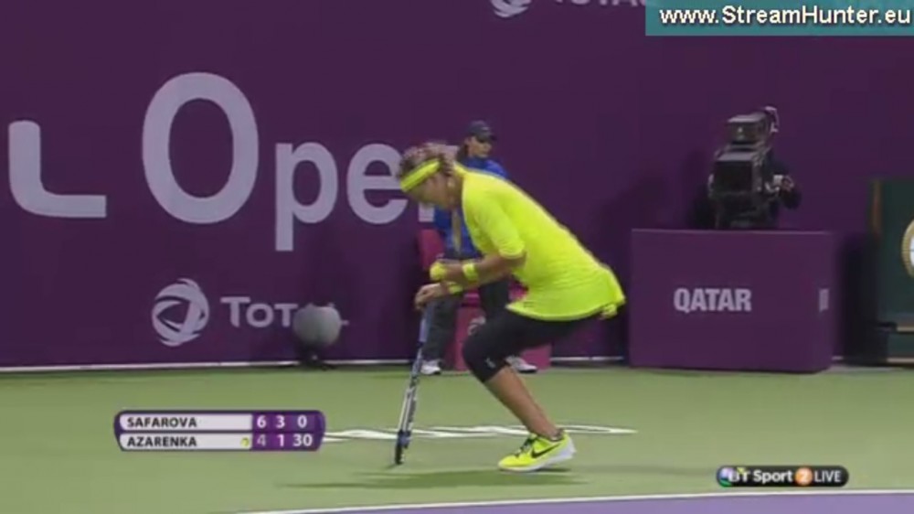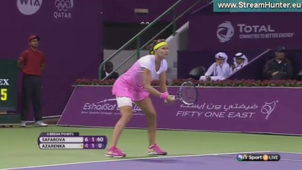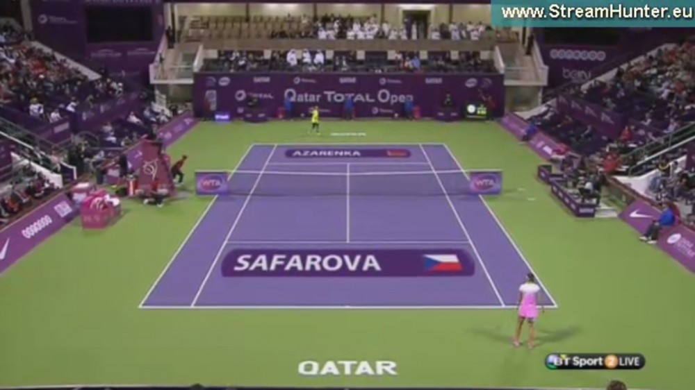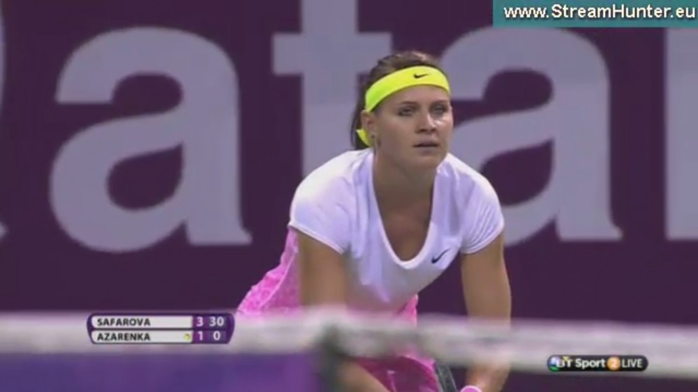 Po zahrání katarské hymny nastupují obě hráčky, usměvavá Lucie Šafářová ve slušivém bílo - růžovém úboru, osmadvacetiletá rodačka z Brna a pětadvacetiletá Viktoria Azarenková z Běloruska ve žlutém a černých legínech pod koleno, ("hučící siréna", mezi tenistkami). Lucie bude hrát o svůj první triumf v této sezóně.