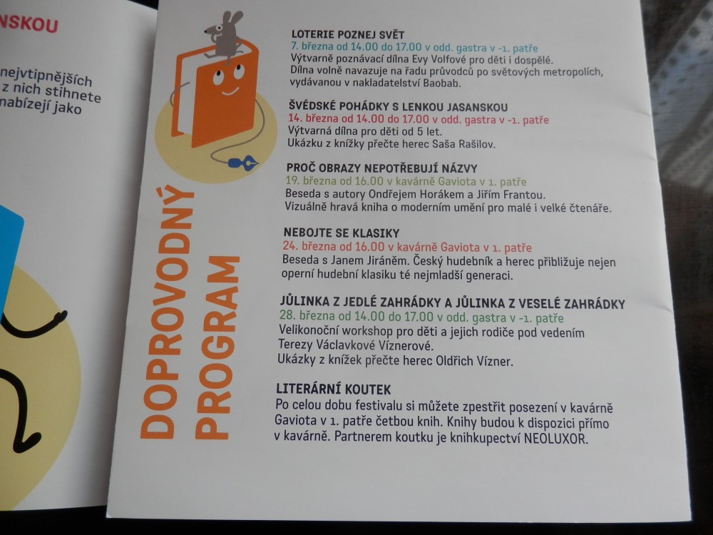 Kromě prodeje knih obsahuje festival i doprovodný program. Ať již je to výtvarně poznávací dílna coby cestovatelská hra Poznej svět, nebo kolekce krátkých švédských pohádek před usnutím nebo vhodná prezentace nejznámějších oper dětskému světu.