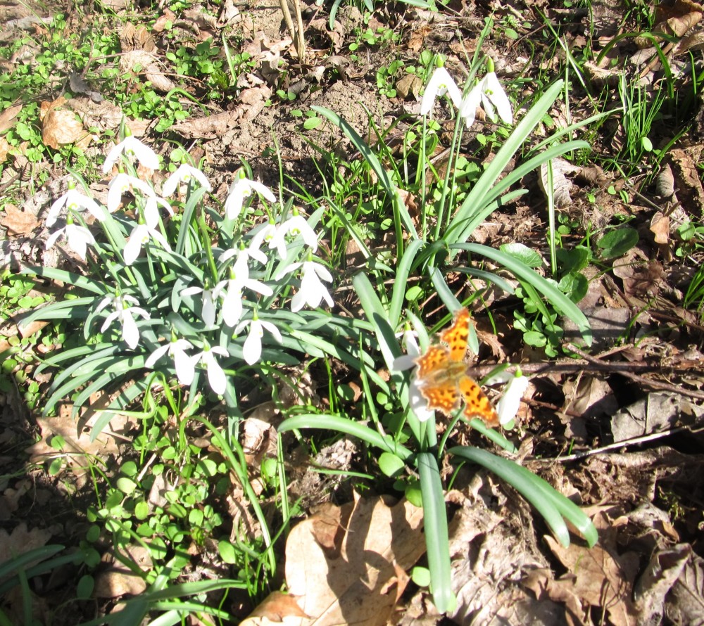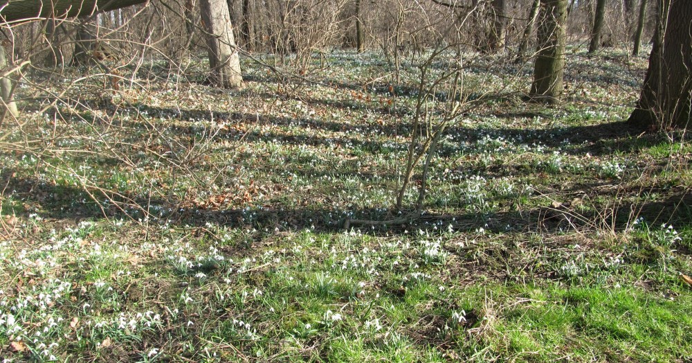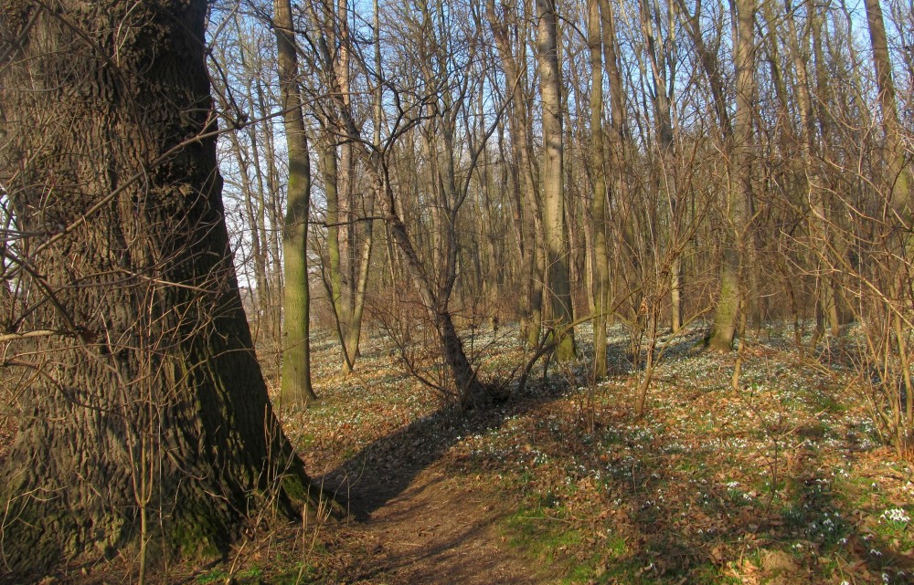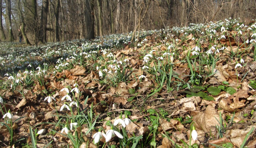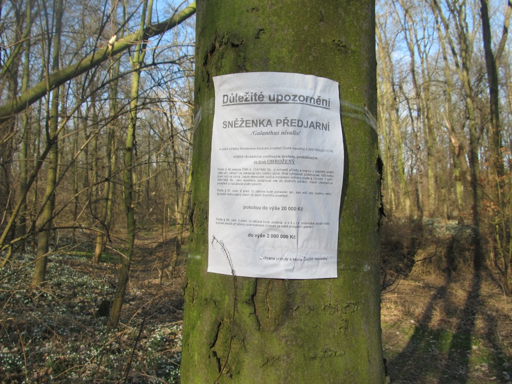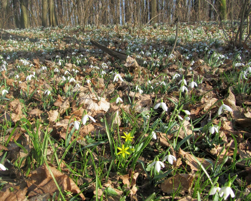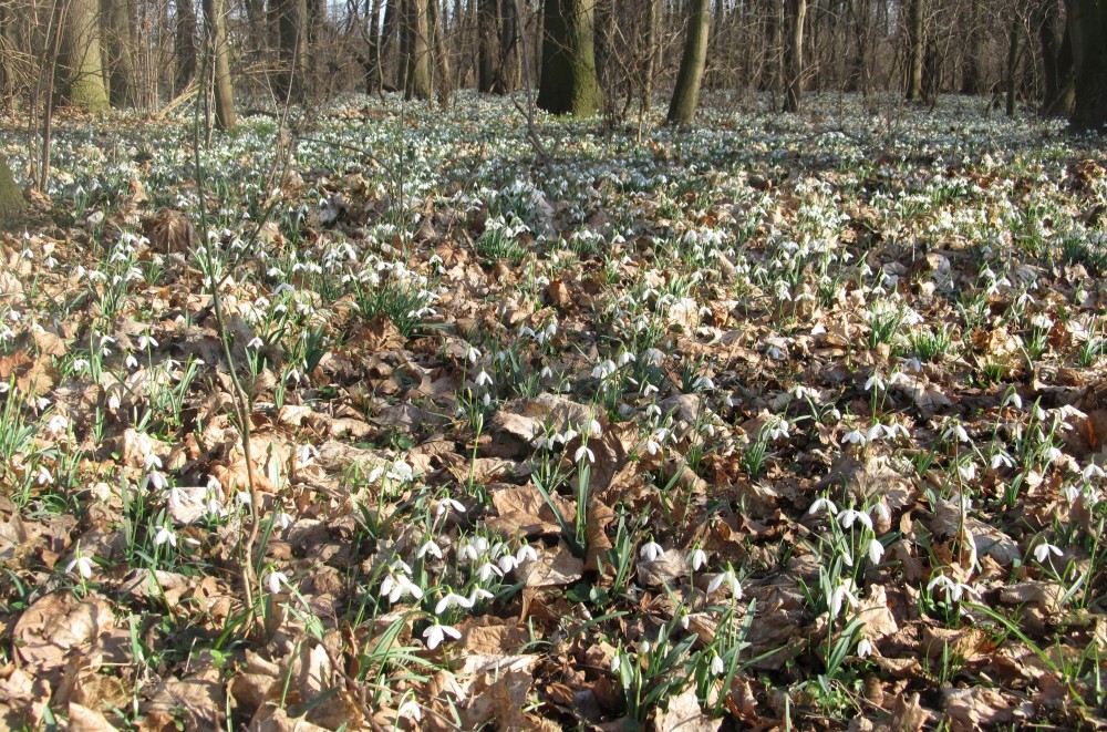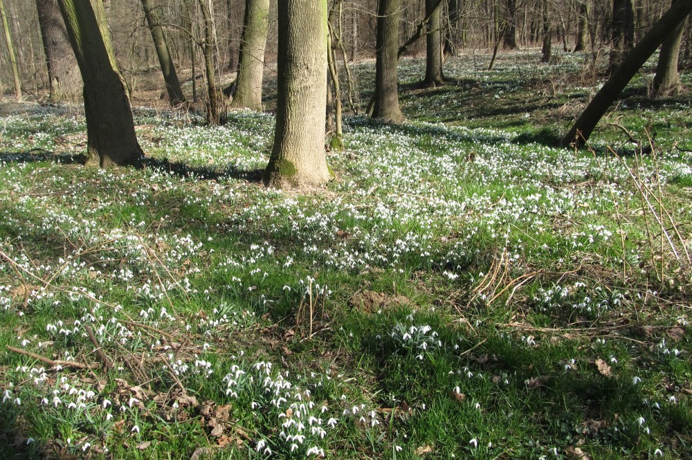 A skutečně, hned po příchodu na okraj háje se našim očím naskytl pohled, jaký neuvidíme často. Všechny moje představy vzaly za své a udiveně jsem se rozhlížela dokola. Pod holými stromy mezi spadaným listím a tu a tam už i zelenou trávou vystrkují na odiv své bílé květy sněženky. Kam se podíváte, vidíte bílé koberce. Tisíce a tisíce bílých květů, sem tam mezi nimi zasvítí i žluť křivatce žlutého. Při bližším pohledu zaznamenáte, že první sluníčko vylákalo na pastvu i včely a dokonce i motýla! Procházíme se po vyšlapané cestičce a nevíme, kam se dřív podívat. Vypadá to, jako kdyby tu bylo nasněženo. Zdá se, že kdybych si natrhala kytičku a odnesla si ji domů, ani by to nebylo v háji k poznání. Ale to by mě ani nenapadlo, ta křehká krása by stejně dlouho nevydržela a v přírodě je pohled na ni mnohem krásnější. Přestože je tu sněženek tolik, ochránci přírody raději všude rozvěsili upozornění na přísný zákaz trhání sněženek. Takže já jsem vytáhla foťák a o tu krásu se s Vámi rozdělím.