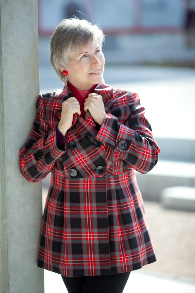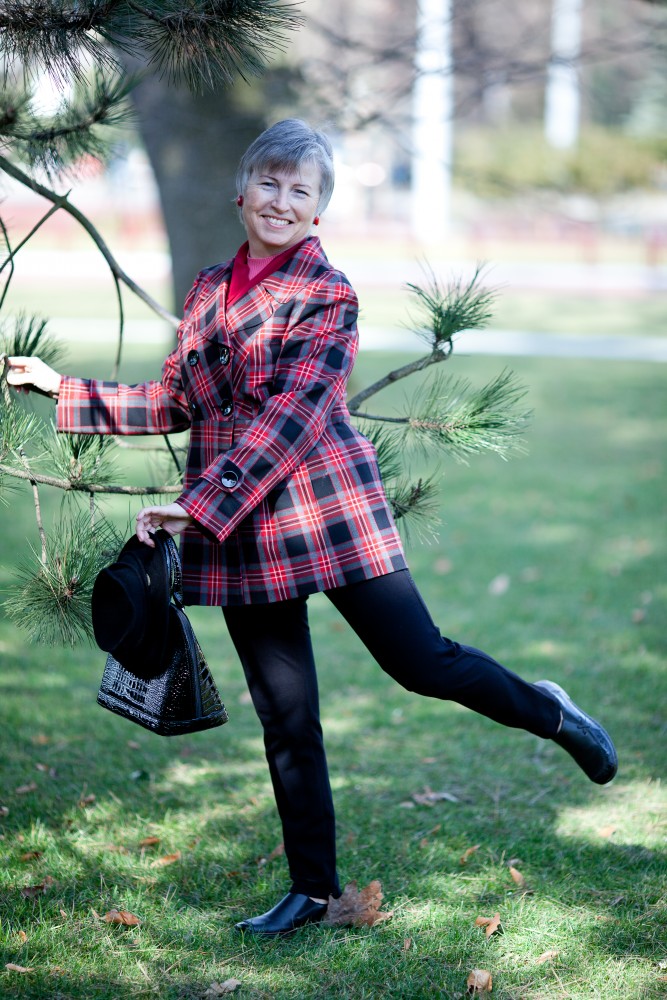 Paní Hano, je vidět, že pózování máte v krvi a fotoaparát Vás má rád. Je fajn, že jste kreativní a že se oblékáním bavíte. Váš model je veselý a svěží. Musím ale podotknout, že elegantní kabelka, zřejmě lakovaná s aplikací "krokodýl", se ke kostce a střihu kabátku moc nehodí. O to více, že jste obula boty ve stylu mokasín. Stejně jako kabelka, tak i klipsy ruší jednotnost stylu.